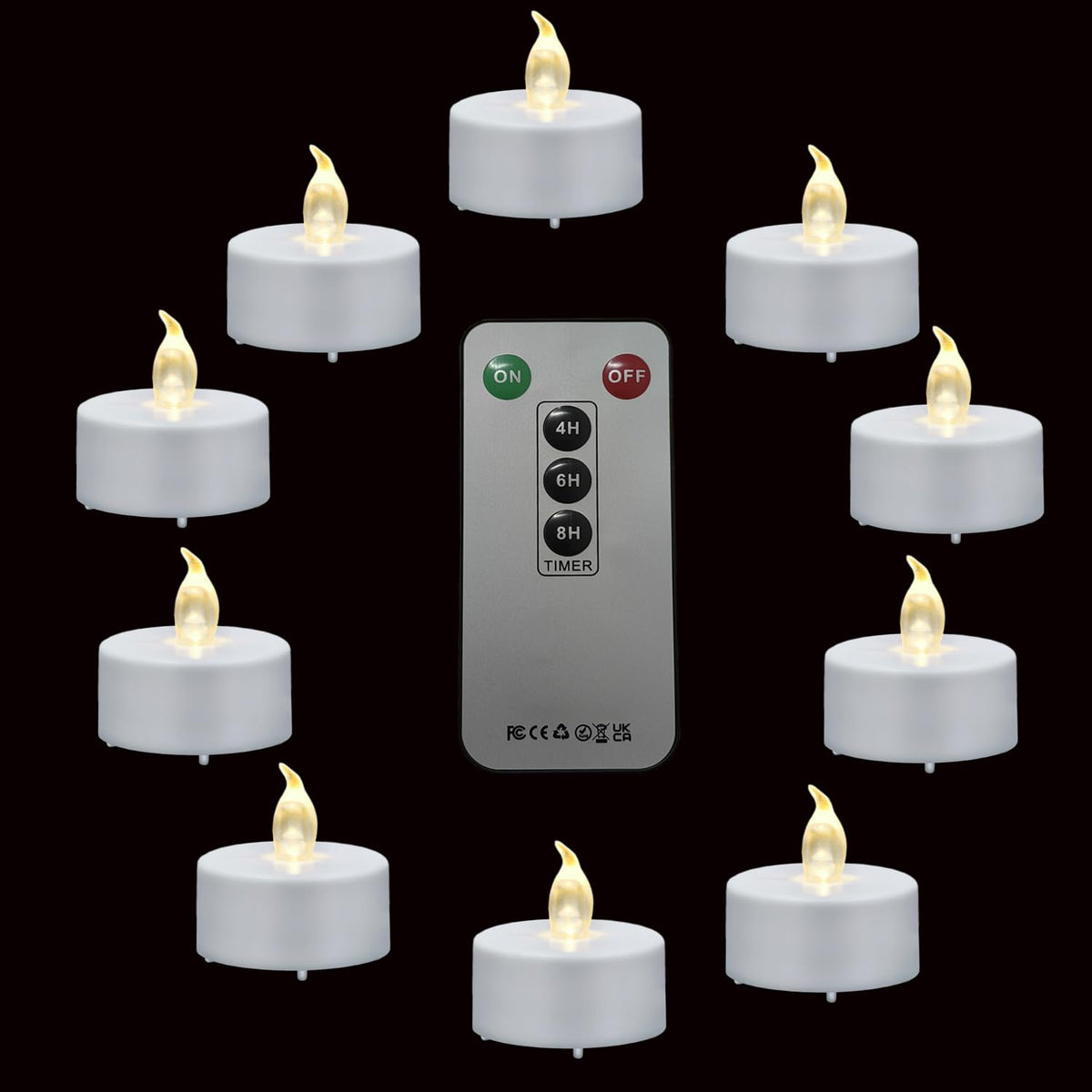 Q: Can I use the remote control to set a timer for the candles?A: Yes, the remote control allows you to operate the tea lights easily, including setting a timer to automatically turn them on or off, making them very convenient for daily use.