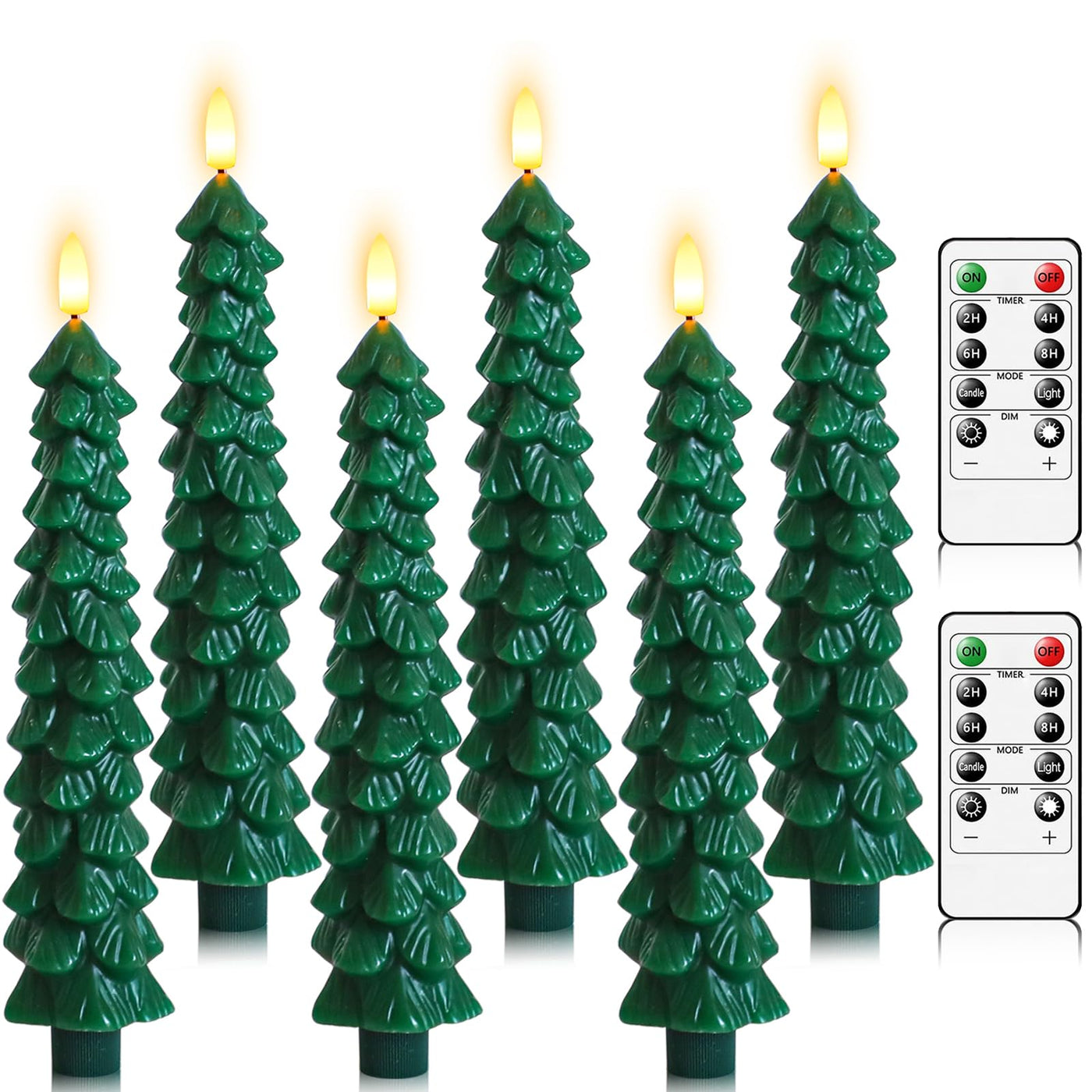 Key Features: Classic Christmas Tree Design: Set of 6 9.5-inch lifelike flameless taper candles Safe & Flameless: led candles with no open flame or heat, safe for homes with children and pets. Convenient Remote Control: Adjust brightness and set automatic timers (2/4/6/8 hours) with the included remote. Versatile Use: Perfect for Christmas tree decor, table centerpieces, window displays, and party setups, New Year, weddings Energy-Efficient: Battery-operated (2 AAA batteries per candle, not included) for long-lasting reuse. Specifications: Single Candle Size: 25cm (10 inches) in height Set Includes: 6 candles + 2 remote control Material: Christmas green wax