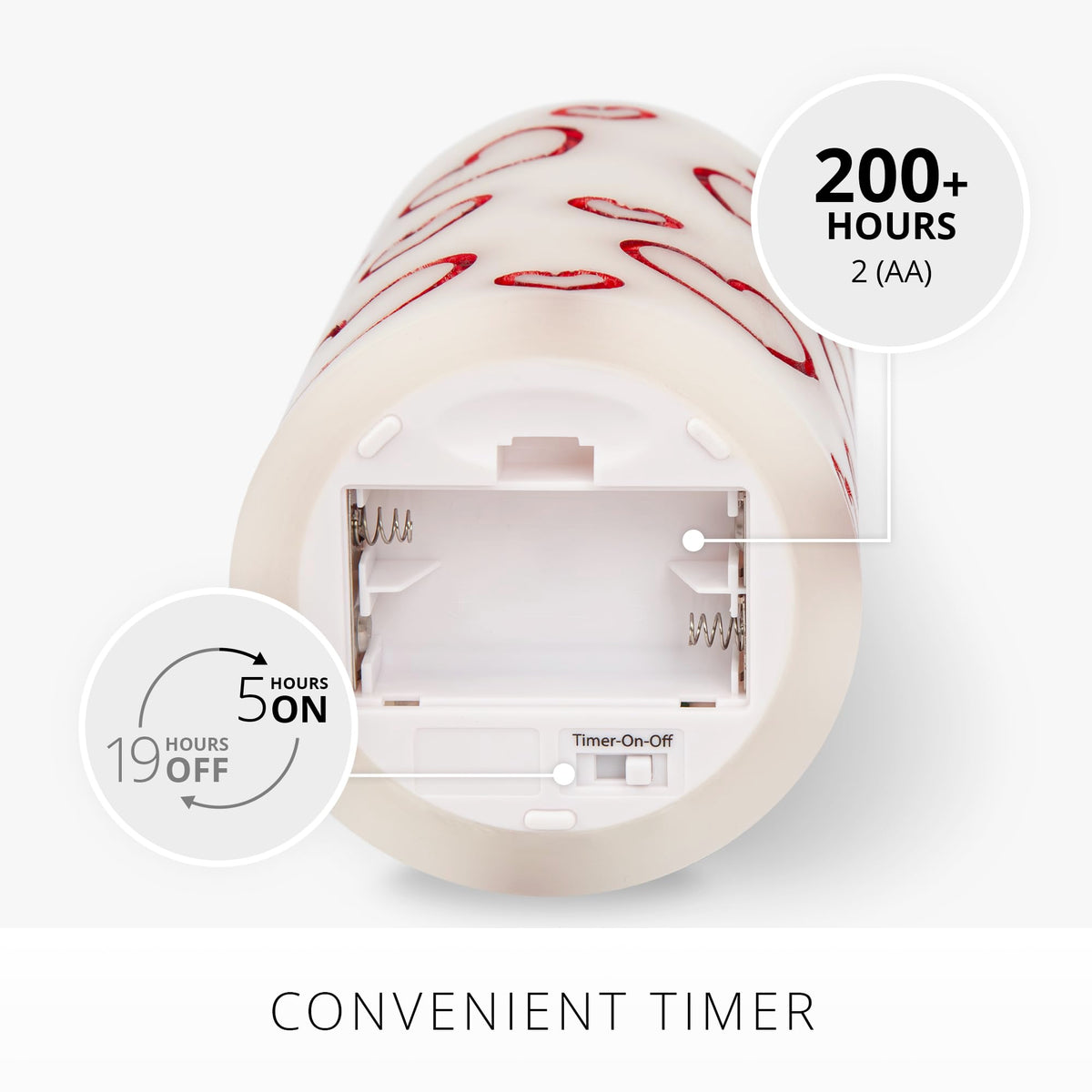 Real Flame-Effect Technology That Creates An Authentic Flickering Flame Appearance. Perfect For Valentine'S Day Centerpieces Or Seasonal Decorative Accents On Mantels And Shelves, These Candles Set A Romantic Mood Anywhere. Safety Comes First With These Flameless Candles. With No Real Fire, Wires, Or Heat, They'Re Completely Safe Around Children, Pets, And Flammable Items. The Convenient Timer Function Activates With A Base Switch - Simply Turn On When Desired, And The Candle Will Operate For 5 Hours, Then Automatically Restart 19 Hours Later At The Same Time. The Warm White Illumination Creates Perfect Ambiance Without Harsh Cold Tones Or Artificial-Looking Colors Common In Other Led Candles. Available In Two Sizes: 3.4'' X 4.5'' And 3.4'' X 6.5''. Made From Genuine Wax With Hand-Painted Metallic Hearts In Your Choice Of Red Or Magenta, These Durable Candles Offer Both Beauty And Longevity. Each Size Provides 200 Hours Of Operation Using Just 2 Aa Batteries. Note: These Are Indoor-Use Only Candles. For Outdoor Romance, Explore Luminara'S Outdoor Collection. All Holiday Candles In The Luminara Collection Are Remote-Compatible But Can Be Operated Using The Base Switch, With Three Modes: Off, On, And Timer. Each Purchase Includes One Candle. Remotes And Batteries Sold Separately.