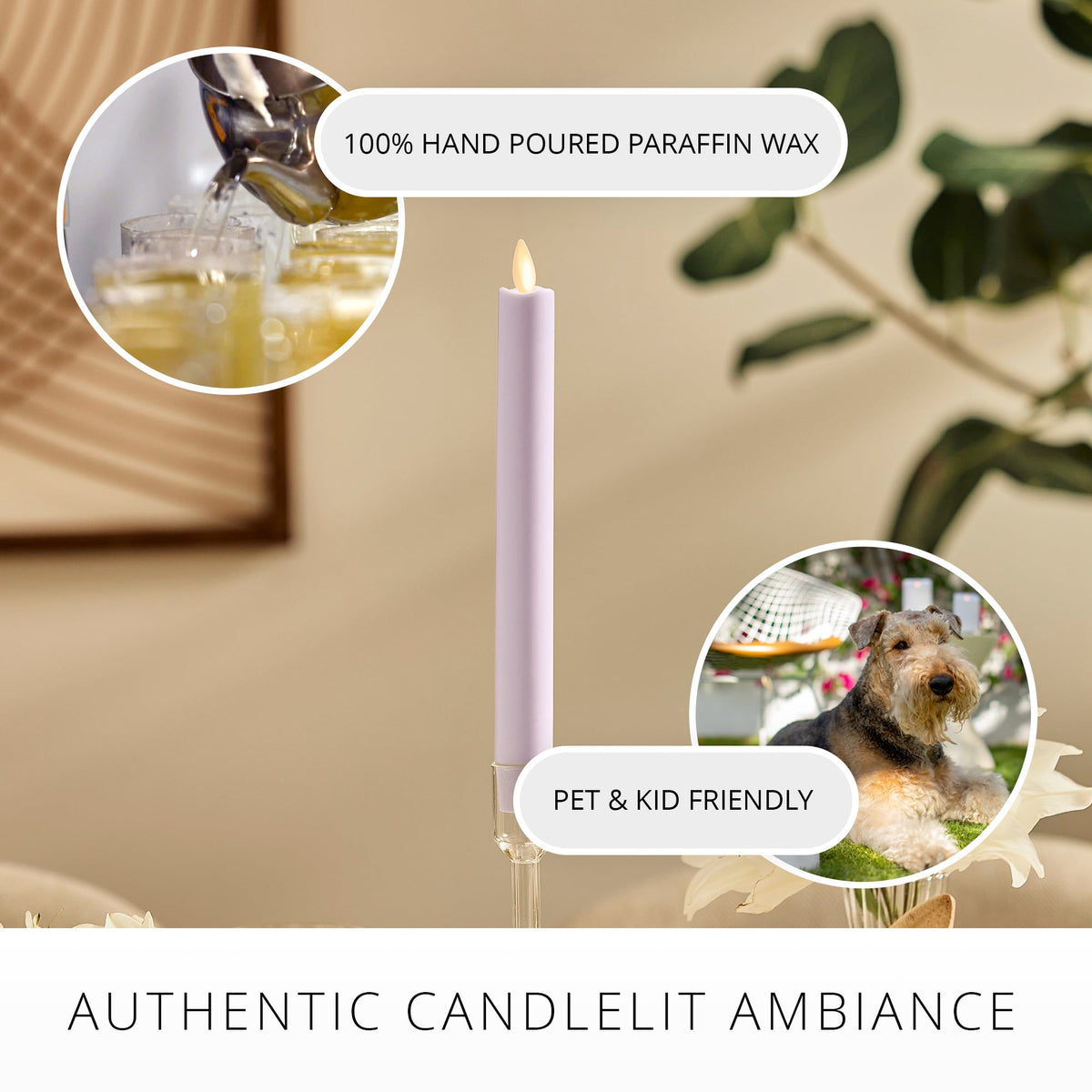 Create An Elegant And Soothing Atmosphere Throughout Your Easter Celebrations With Our Gentle Lavender Taper. Complete With Patented Moving-Flame Technology, This Soft Pastel Purple Taper Is Dipped In Genuine Wax And Has A Smooth Finish With A Melted Top Relief. The Magical Glow And Gentle Color Of The Taper Is A Stunning Compliment To Easter Table Centerpieces And Also Makes A Chic Accessory To Other Spring-Themed Decorations In Need Of Festive And Worry-Free Candlelight.