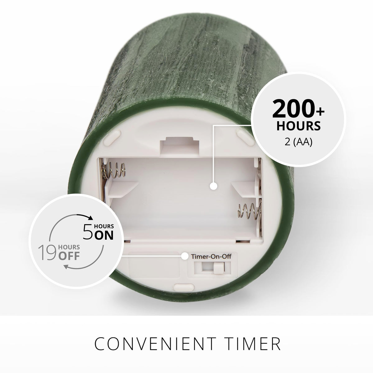 Q: How long do the batteries last in the Luminara flameless candle?A: The Luminara flameless candle operates on 2 AA batteries, which are not included. Each candle provides up to 200 hours of illumination, allowing for extended use without frequent battery replacements.