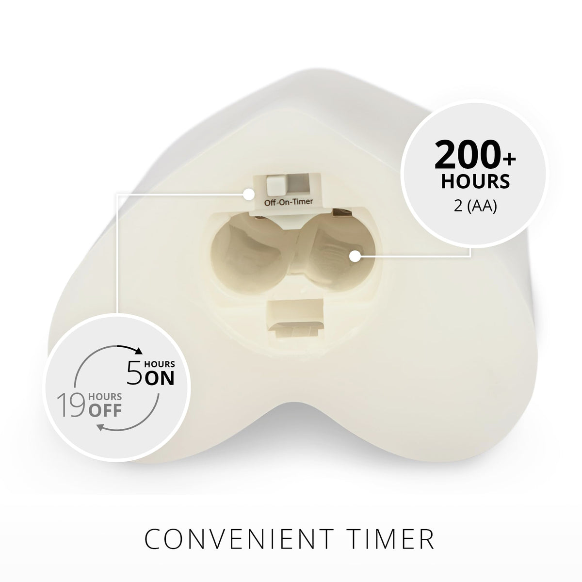 Q: How long do the batteries last in this candle?A: The Luminara Heart Shaped Pillar Candle requires 2 AA batteries, which provide over 200 hours of illumination before needing to be replaced.