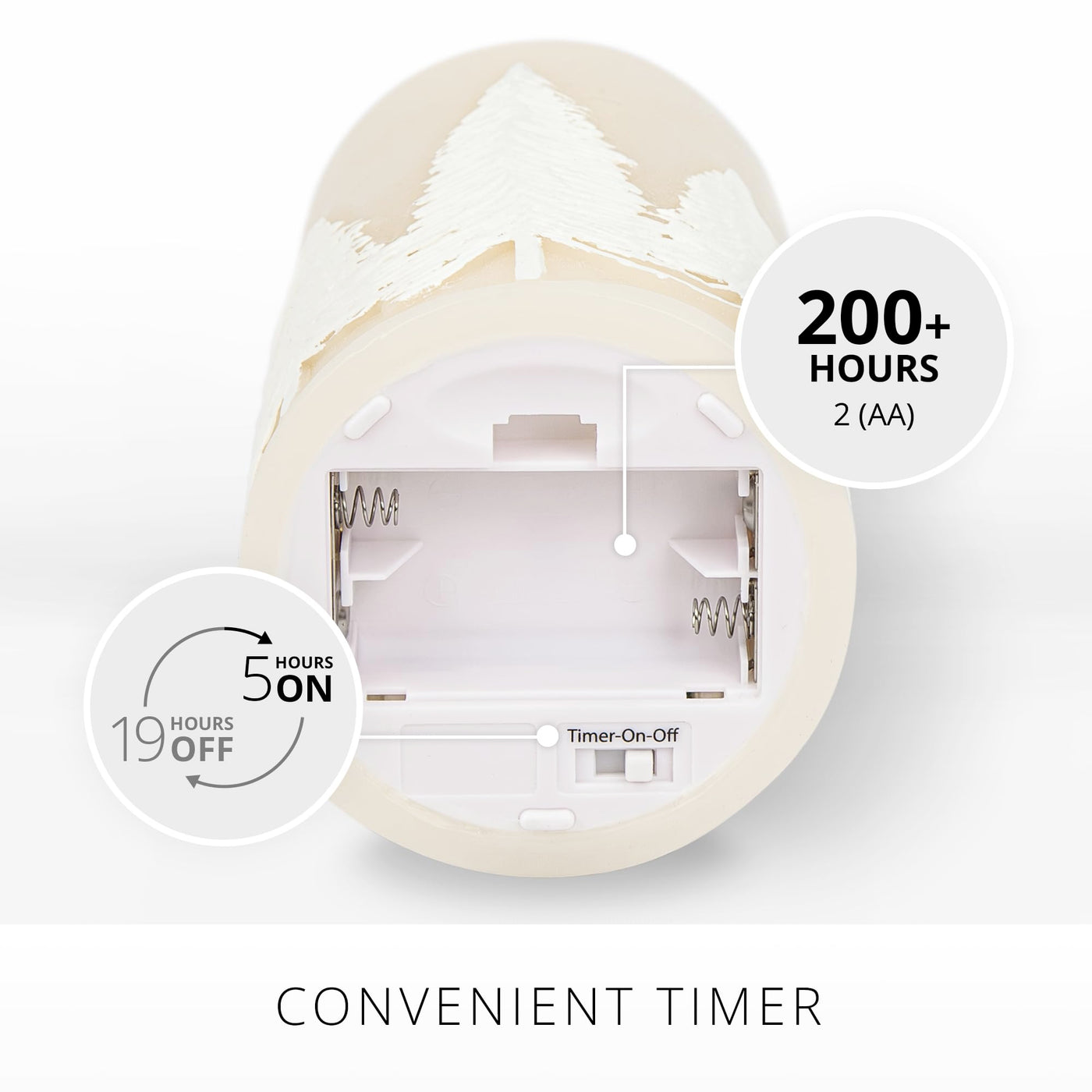 Q: Can I set a timer for the Luminara flameless candle?A: Yes, the Luminara White Swan Embossed Trees Flameless LED Candle includes a convenient timer feature. You can set it for 5 hours of brightness followed by a 19-hour automatic shutdown, ensuring effortless operation.
