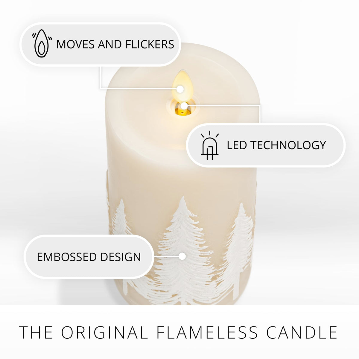 Q: What makes the Luminara White Swan Embossed Trees Flameless LED Candle unique?A: The Luminara White Swan Embossed Trees Flameless LED Candle features patented Real Flame-Effect Moving Flame technology, providing a realistic flickering effect without the hazards of an open flame. Its elegant design with white winter tree reliefs adds a festive touch to your décor.