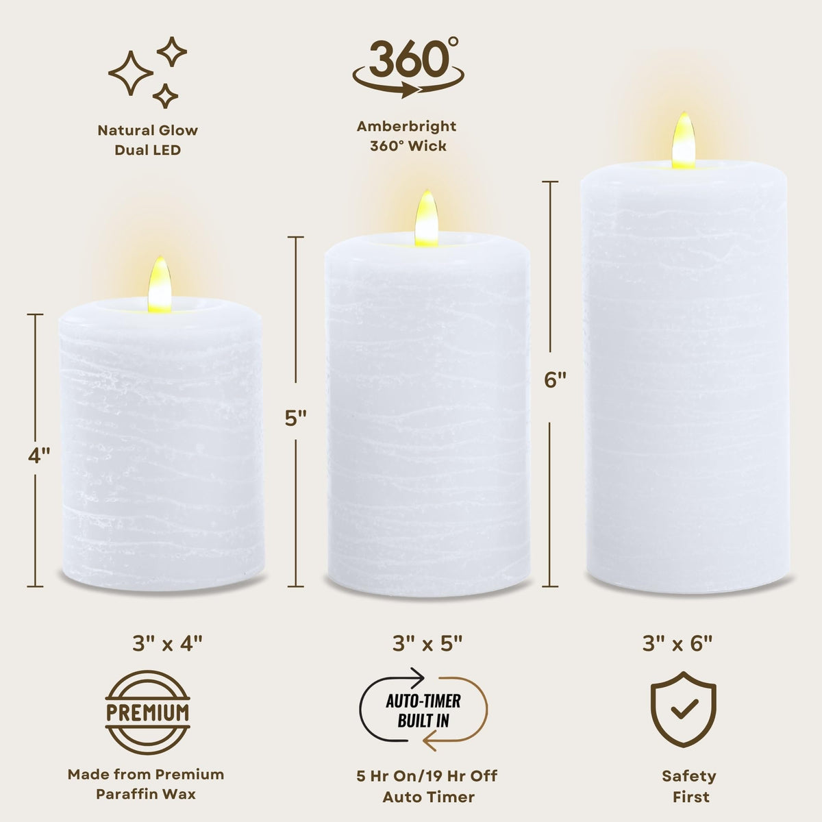 Lumipur Essentials Natural Glow Flameless Flickering Wax Pillar 3 Pack Led Candles (3'' X 4'' 5'' & 6'') Winter White