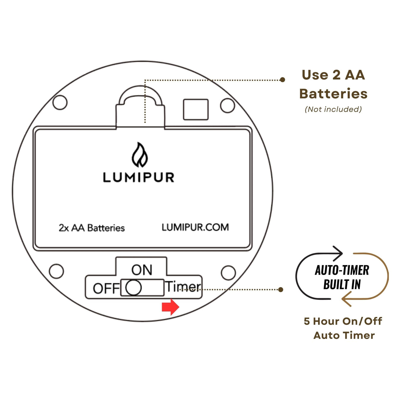 Q: How long do the batteries last in the LumiPur Essentials LED candles?A: The LumiPur Essentials LED candles operate on 2 AA size batteries and are designed for over hundreds of hours of continuous use on a single battery change. This long battery life, combined with the built-in 5-hour AUTO ON and 19-hour AUTO OFF timer, allows for months of use without needing to replace the batteries.