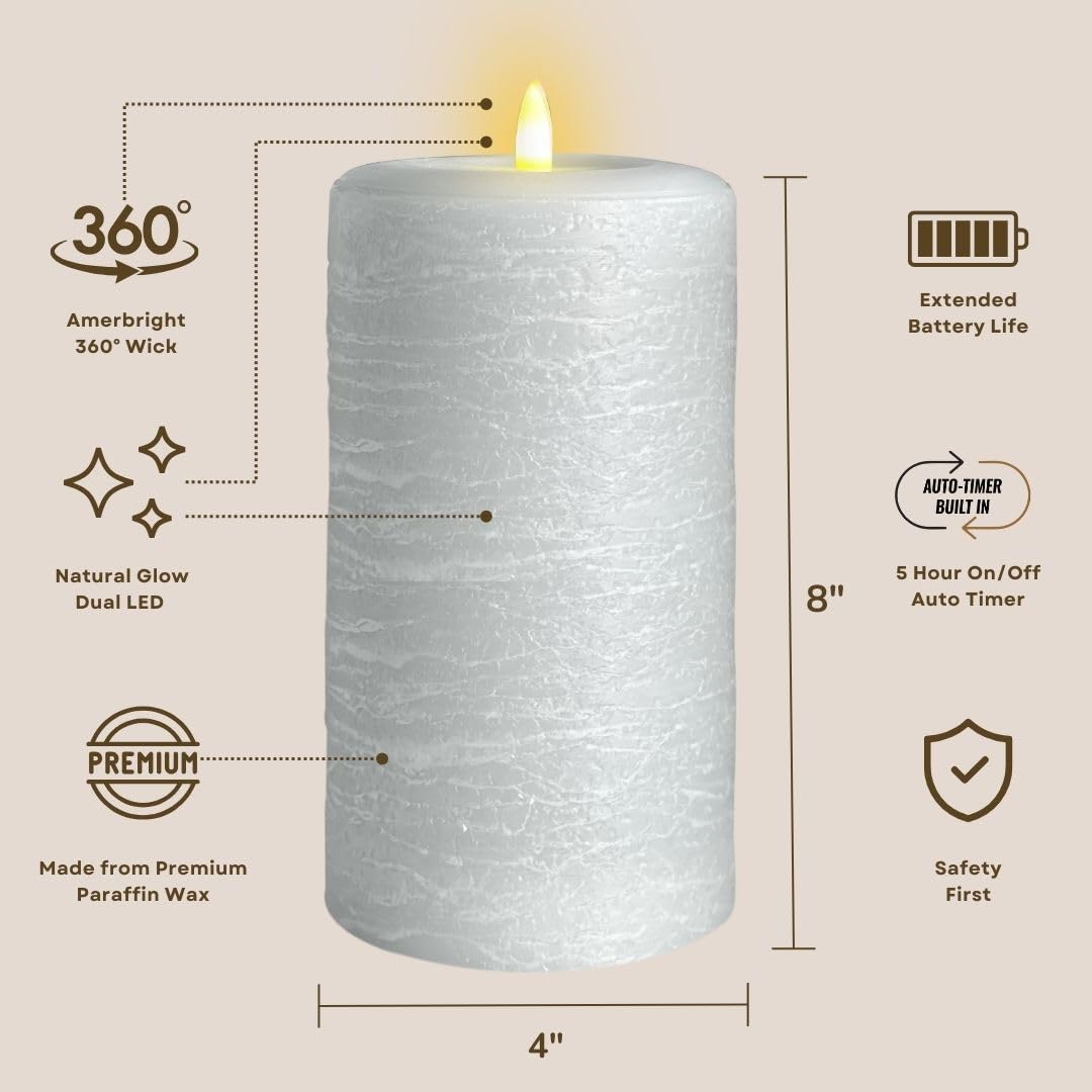 Q: What are the dimensions of the LumiPur Signature Natural Glow Flickering Flameless LED Wax Pillar Candle?A: The LumiPur Signature Pillar Candle measures 4 inches in diameter and 8 inches in height, providing a larger presence compared to standard candles.