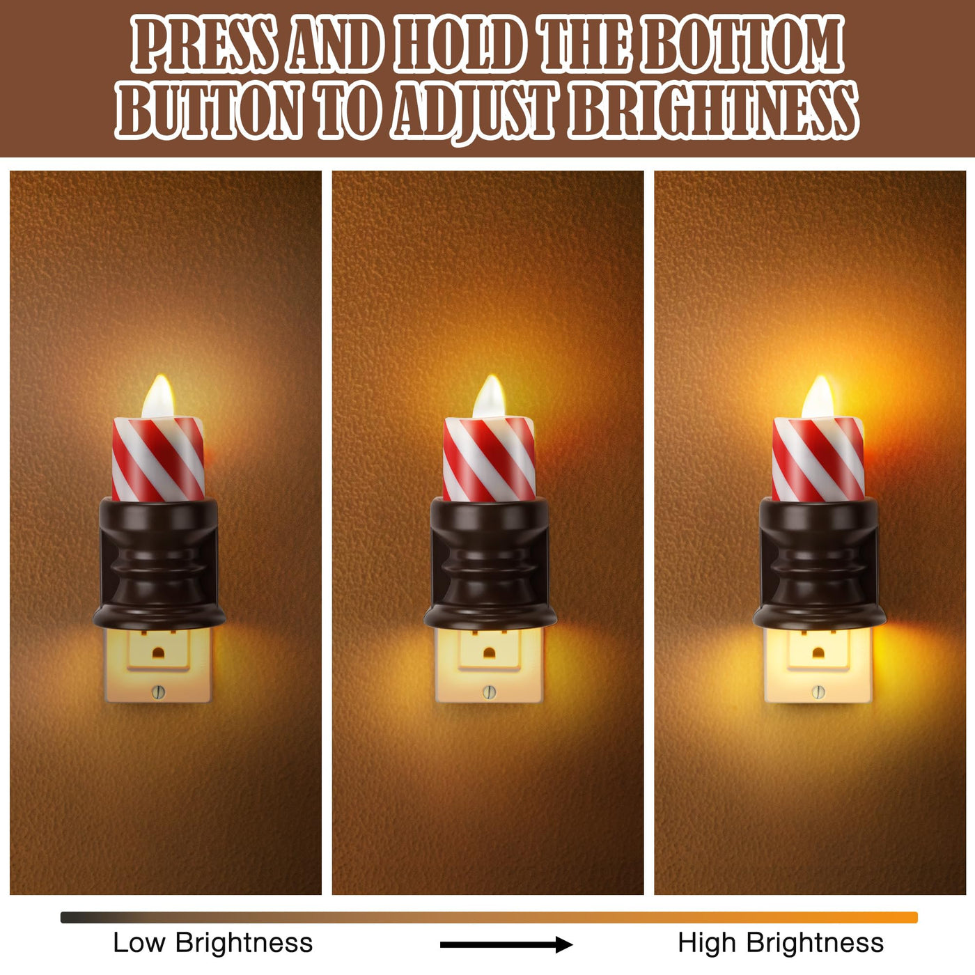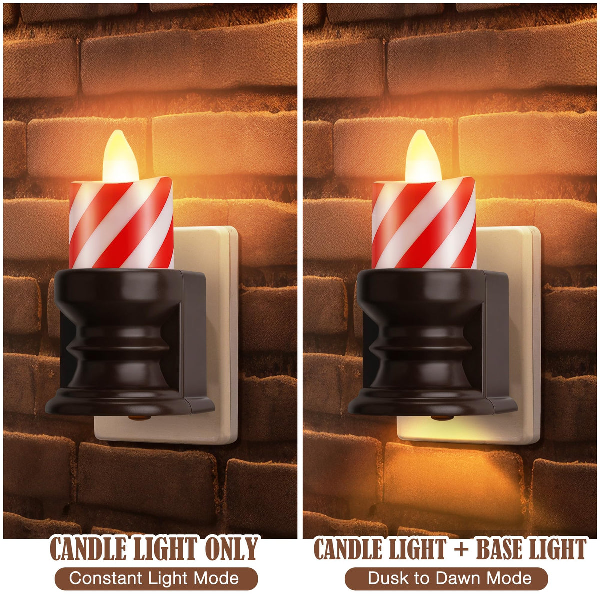 Bring The Charm Of Flickering Candles Into Your Home With Our Simulation Candles, Where Safety, Style, And Functionality Unite To Create An Enchanting Ambiance. Dimming: When The Bottom Night Light Is On, Long Press The Button To Adjust The Brightness Of The Bottom Night Light. (Long Press The Button To Adjust To Minimum Brightness/ Long Press The Button To Adjust To Maximum Brightness) 3 Adjustment Mode: Mode 1: Plug In The Power, Candle Light + Bottom Night Light Always On (Default Mode) Mode 2: When The Button Is Pressed For The First Time, Flashes Once And The Candle Light Turns On (Dusk To Dawn) Mode 3: Press The Button For The Second Time, Flash Twice, The Candle Light + Bottom Night Light Will Light Up (Dusk To Dawn) Press The Button For The Third Time To Return To Mode 1 Specifications: Light Color: Candy Cane Red Ac Input Voltage: 120V Ac Input Frequency: 60Hz Color Temperature: 2000K100K Candlelight: 2835 0.2W Led Life Span: =30, 000 Hours Material: Abs Working Environment: -540?