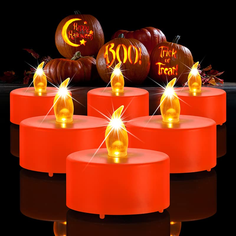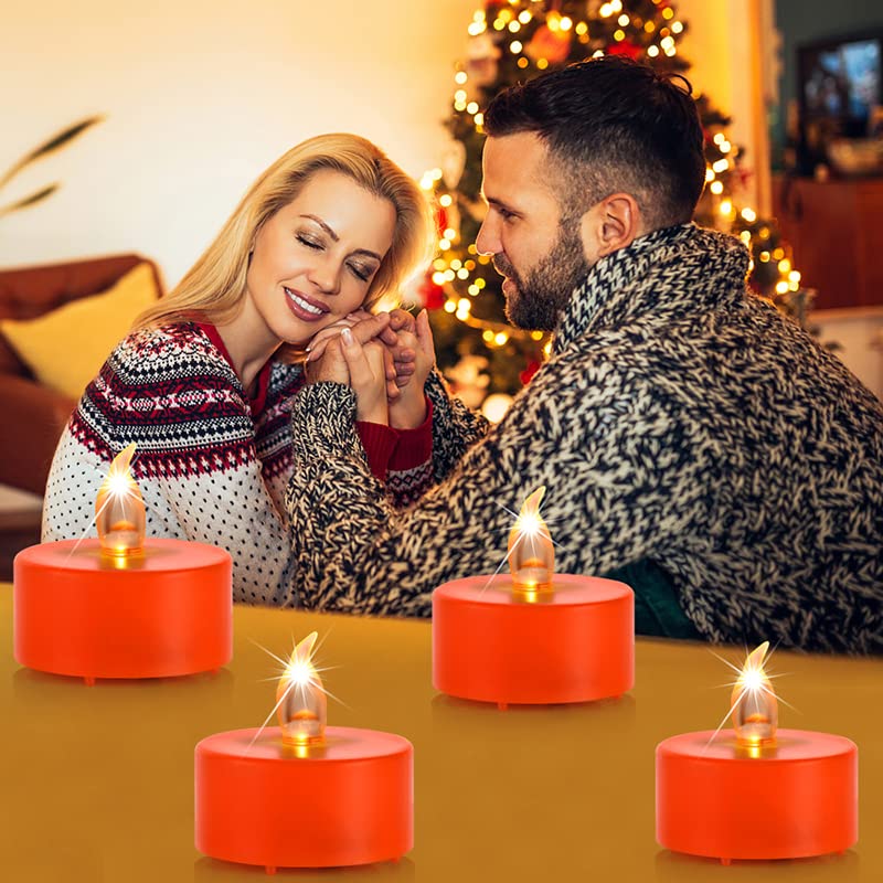 Q: What occasions are these orange tea lights suitable for?A: These orange tea lights are perfect for a variety of occasions, including Halloween, Thanksgiving, Christmas, Valentine's Day, and birthday parties. Their realistic flickering effect creates a warm and inviting atmosphere for any festive gathering.
