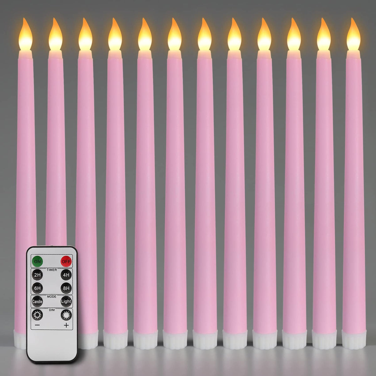 Ni-Jasw Pink Flameless Taper Candles With Remote Set Of 12Specificationsize:28Cmx2.1Cm = 11 Inch X 0.82 Inchpackage Includes: 12 Pieces Battery Taper Candles, 1 Remote Controlbattery Type:Each Led Taper Candle Takes 2 Aaa Batteries(Not Included), Lasting Over 300 Hours, Remote Control Takes 1 Cr2032 Coin Cell( Included)Features10 Key Remote Controlled Candles - You Can Use Remote To Control Power, Set 2/4/6/8 Hours Timer, Set Flickering Or Static Flame Effect And Adjust Brightness, Max Remote Range 20 Ftrealistic & Safe - It Is Hard To Tell The Difference From Real Candles, Giving Off Warm White Glow, Great Alternative To Real Candles And Safe, No Fire-Risk, No Drips, Especially Great For Kids Or Pets, Great Decoration For Home, Wedding, Birthday, Party, Bridal Shower, Seasonal Festival Holiday Decor And Also A Wonderful Gift.