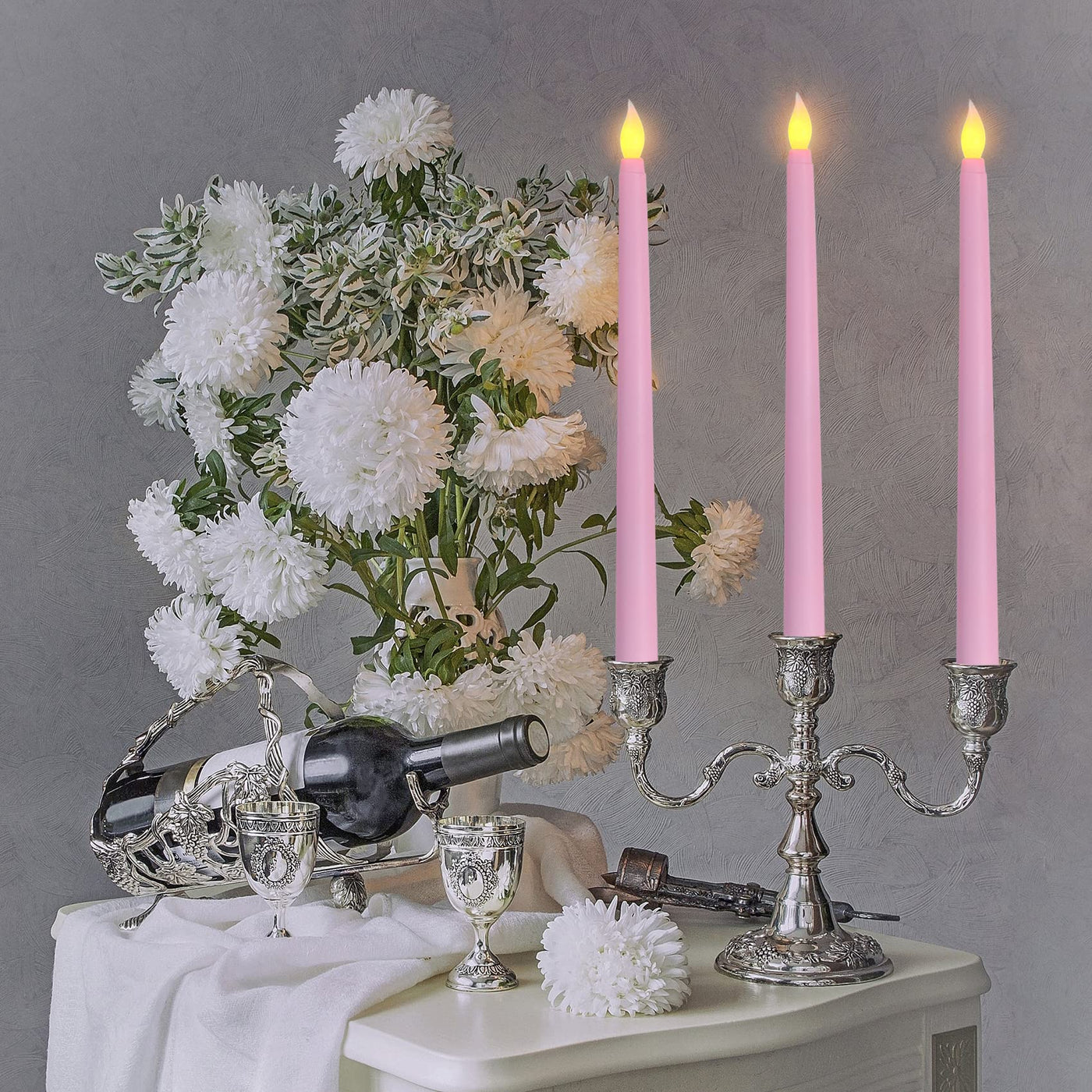 Q: What colors are available for these flameless taper candles?A: While this specific set features pink flameless taper candles, they are available in various colors like white, green, black, orange, purple, blue, and red, catering to different decor styles and occasions.