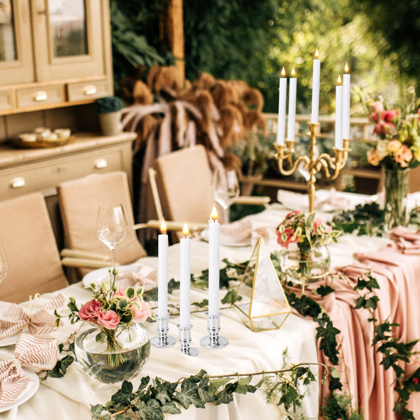 Q: What type of decor styles do these flameless candles complement?A: These flameless candles, featuring a sleek silver base and elegant design, complement a variety of decor styles, including modern, traditional, and rustic themes. They are perfect for enhancing the ambiance of weddings, parties, and home decor.