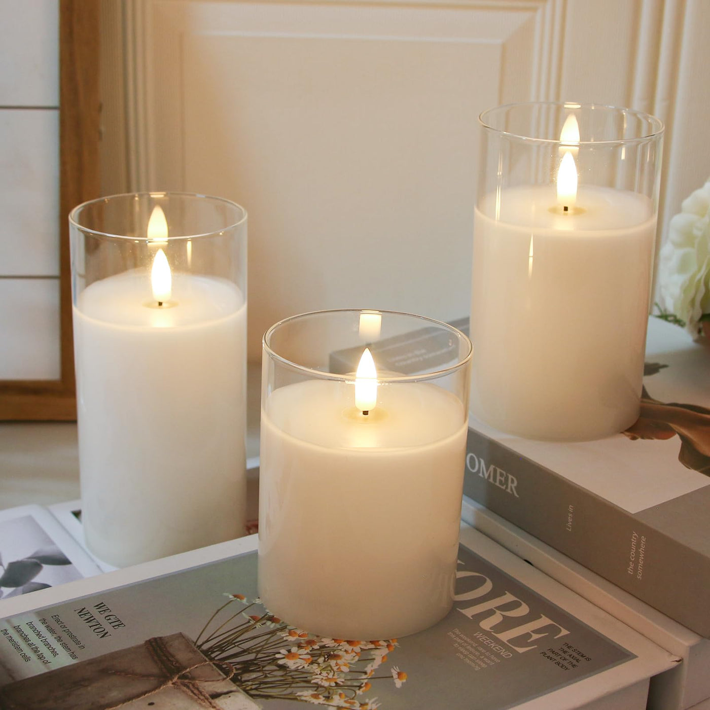 Q: What are the dimensions of the Pure White Glass Flameless Candles?A: The Pure White Glass Flameless Candles come in a set of three, with each candle having a diameter of 3 inches. The heights of the candles are 4 inches, 5 inches, and 6 inches.