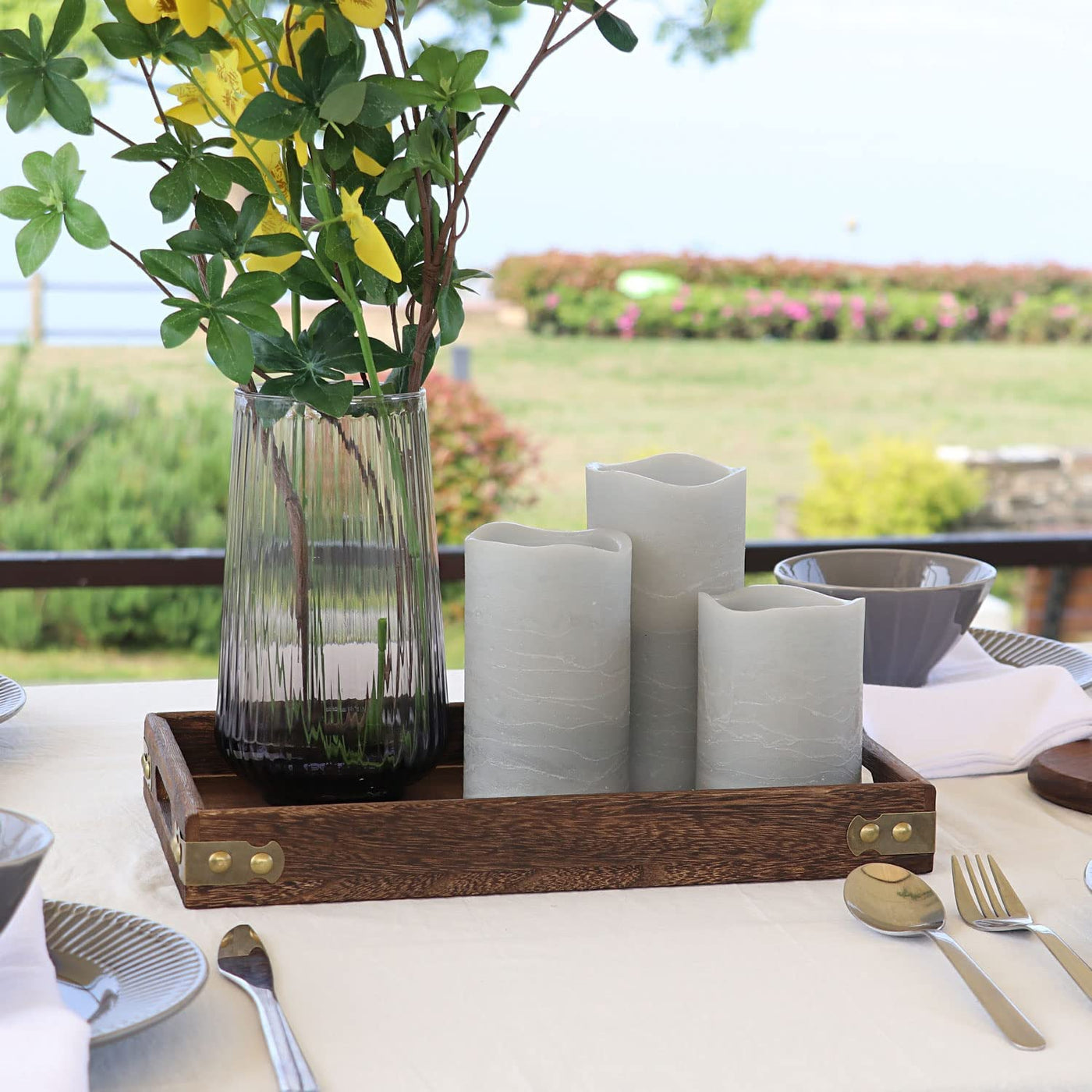 Q: What occasions are suitable for using these flameless candles?A: These gray rustic pillar candles are perfect for various occasions, including weddings, birthday parties, and intimate gatherings, as they create a warm and inviting atmosphere without the risk of fire.