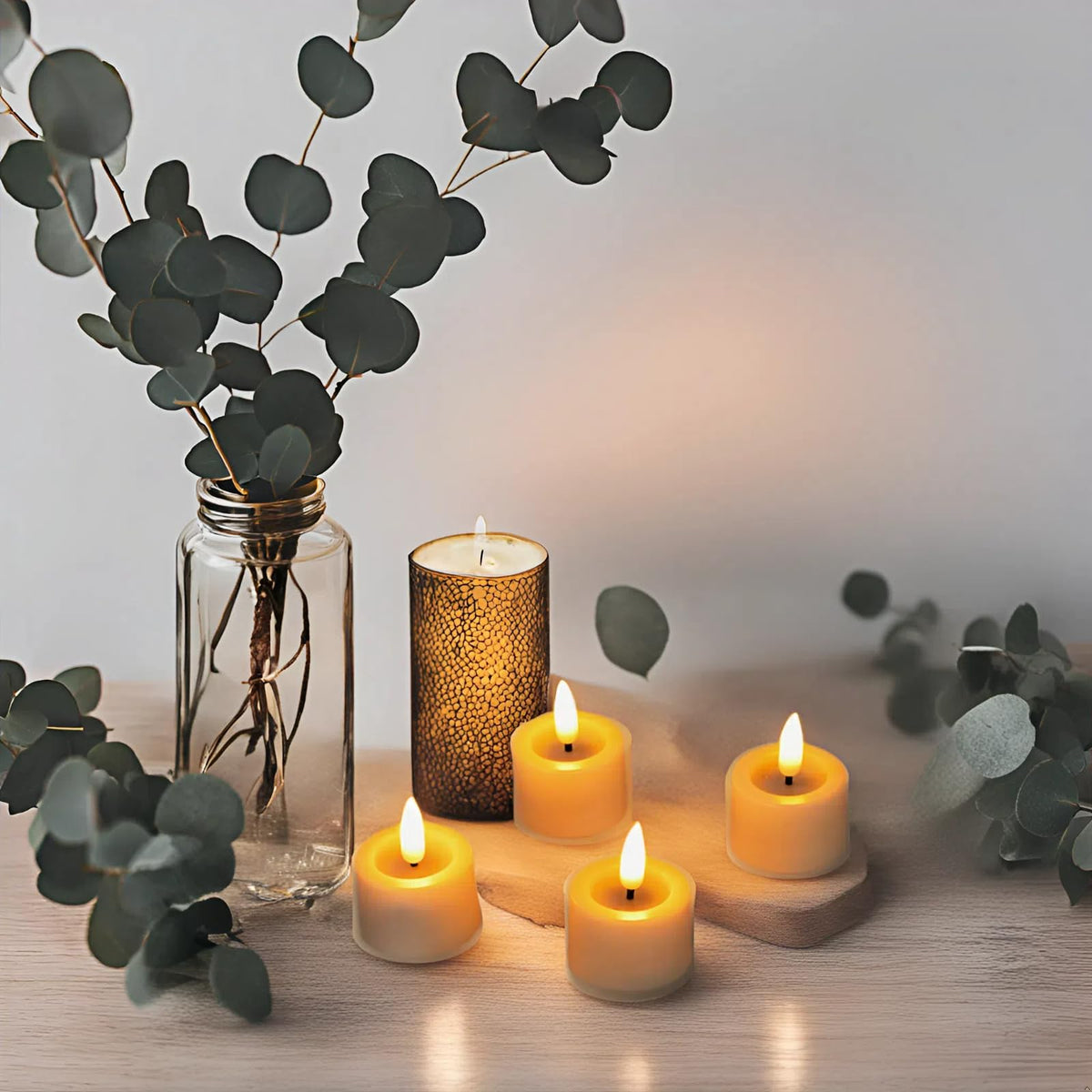 Q: What color are the Simplelight tea lights, and do they resemble real candles?A: The Simplelight tea lights come in an amber color, designed to mimic the warm glow of real candles, creating a cozy ambiance without the dangers of an open flame.