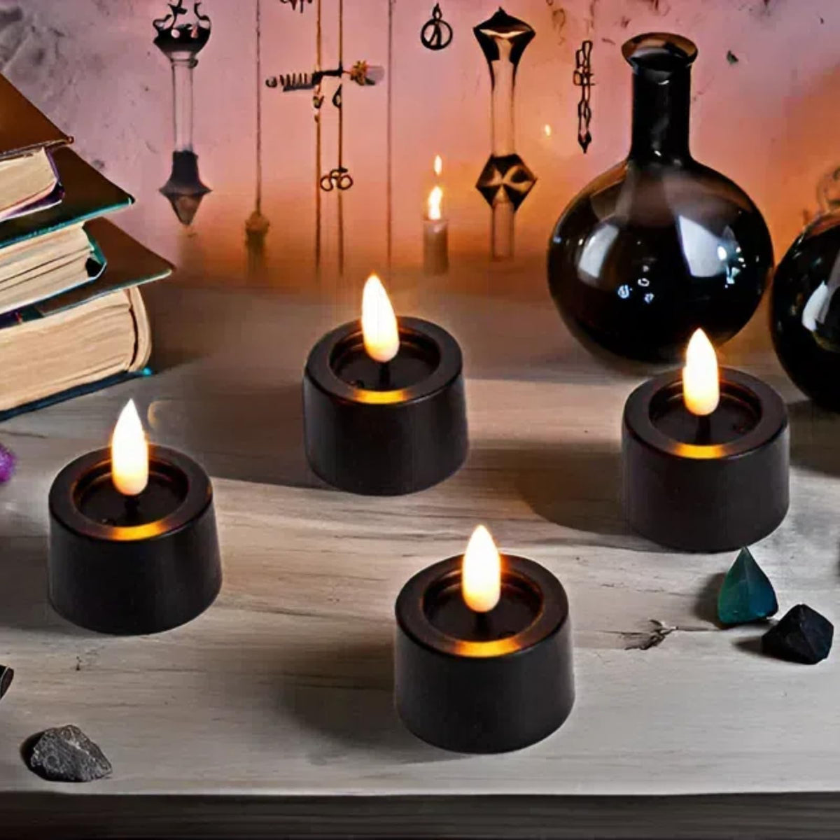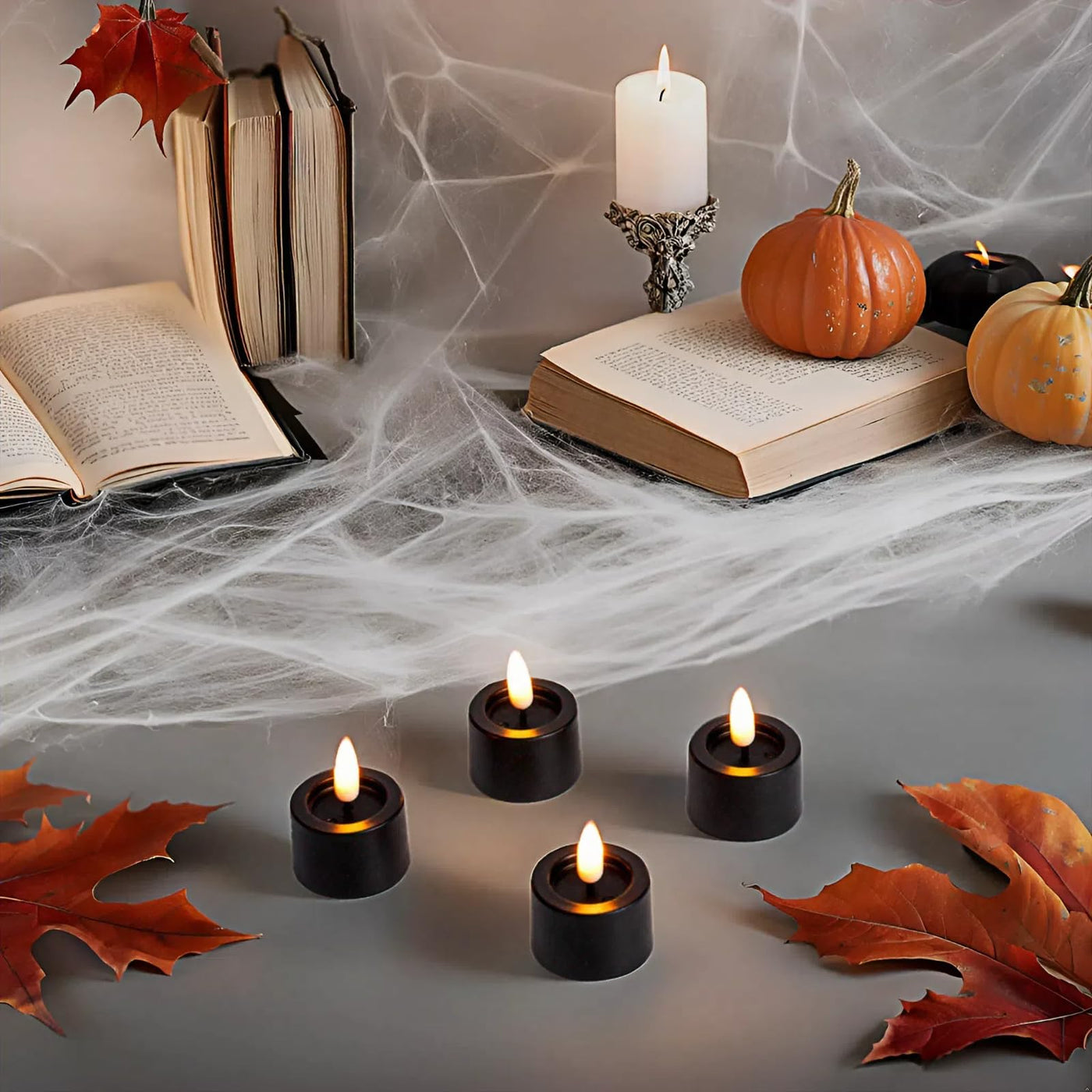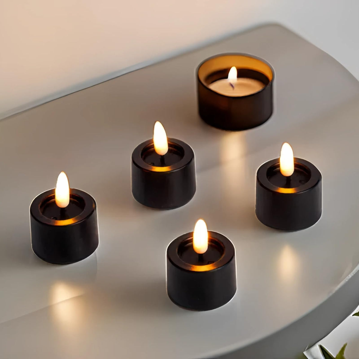 Q: What occasions are these battery tea lights suitable for?A: These black battery-operated tea lights are perfect for a variety of occasions, including Halloween, Christmas, weddings, and other events, adding a touch of elegance and ambiance to any setting.