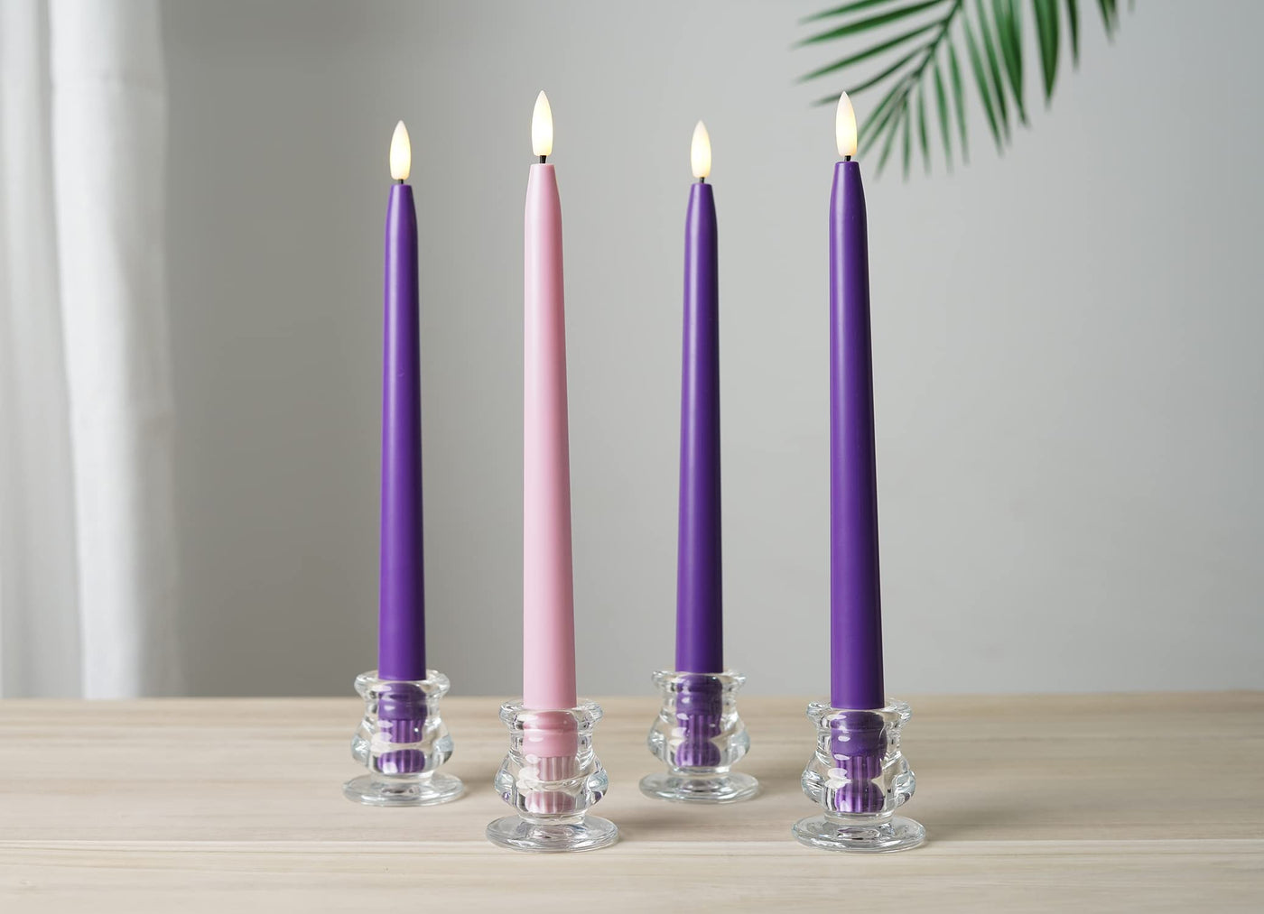 Battery Operated Advent Taper Candle Set Includes 3 Purple Flameless Tapers And 1 Pink Flameless Taper. Safe Battery Operated Advent Candles. Candles Are 11 Inches High And Made Of Durable Plastic. Our Taper Candles Fit Into Virtually Any Taper Candle Holder. Flickering Warm White Led Flame.