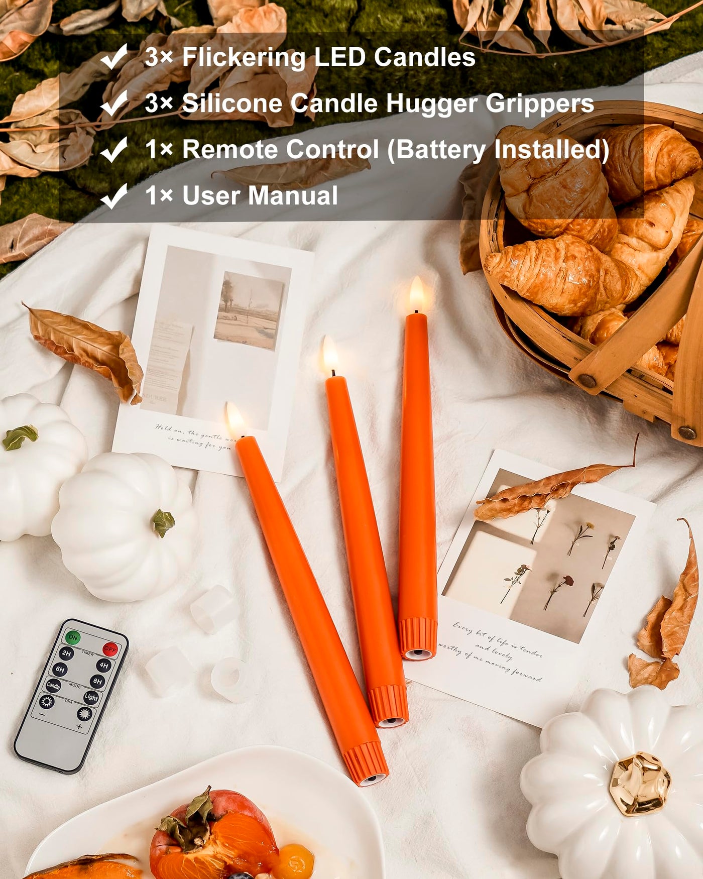 Stmarry Orange Flameless Taper Candles With Remote And Timer, 9.65 Inch Real Wax Led Candlesticks, Fall Taper Candles Battery Operated With 3D Flickering Flame, Thanksgiving Candles For Table, 3 Pack