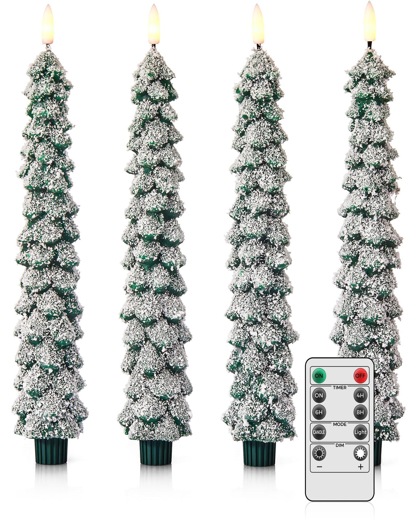 Velsyn 4 Pack Christmas Tree Candles Covered in Snow with Remote, 11 Inch Real Wax flameless Taper Candles, LED Candle Battery O