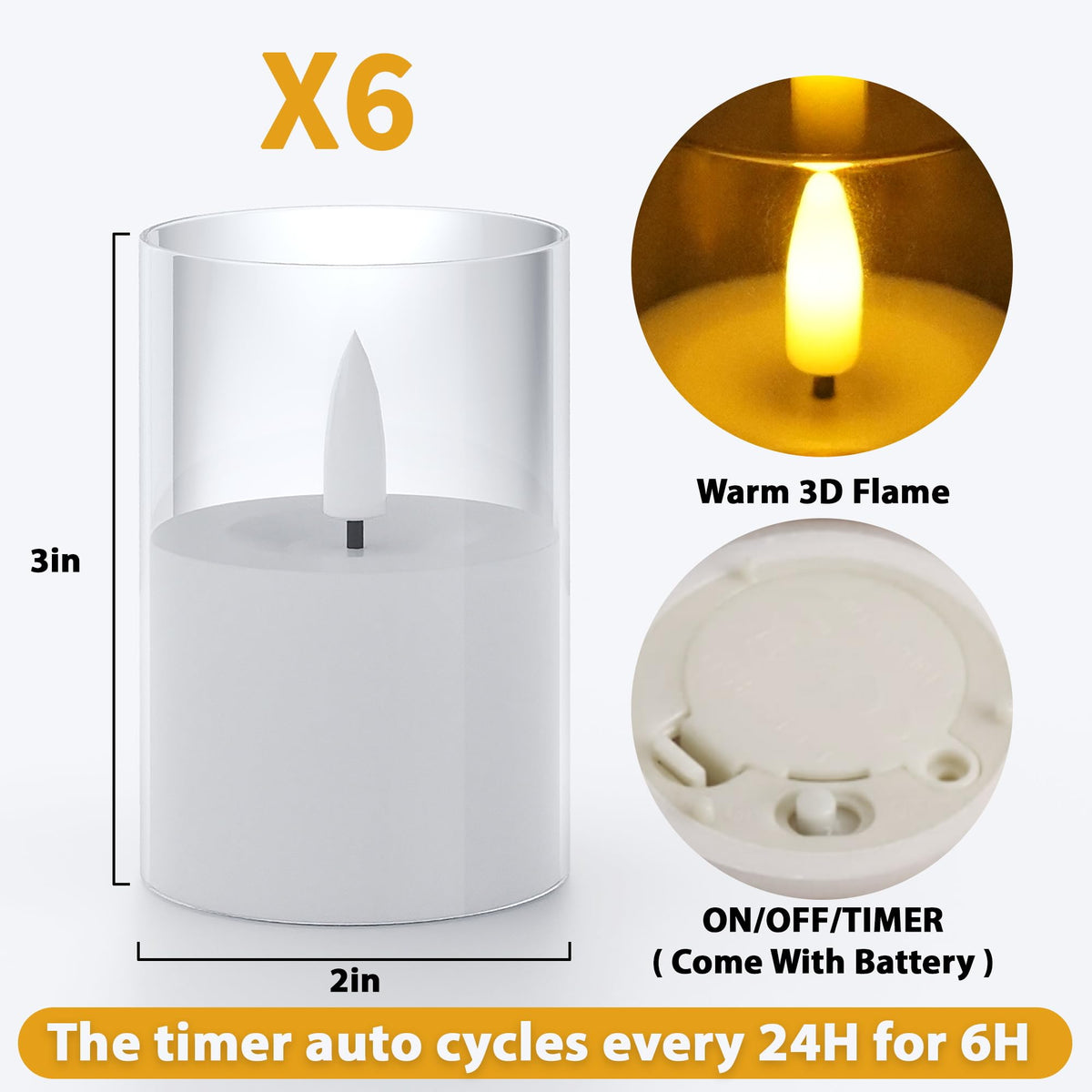 Q: What are the dimensions and materials used in the candles?A: Each candle in the VIODAIM 6Pack measures 2 inches in diameter and 3 inches in height. They are made from a durable acrylic material that is lightweight and less fragile than glass, making them easy to handle and ideal for various decorative settings.