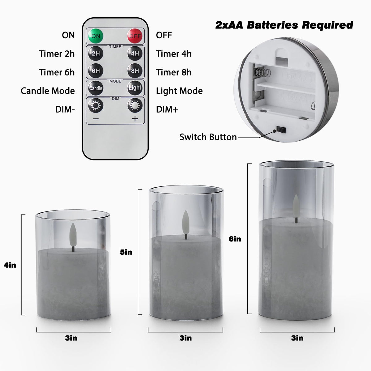 Q: What sizes are included in the VIODAIM candle set?A: The VIODAIM flameless candle set includes three candles with diameters of 3 inches and heights of 4, 5, and 6 inches. This variety allows for flexible placement and decoration options in your home.