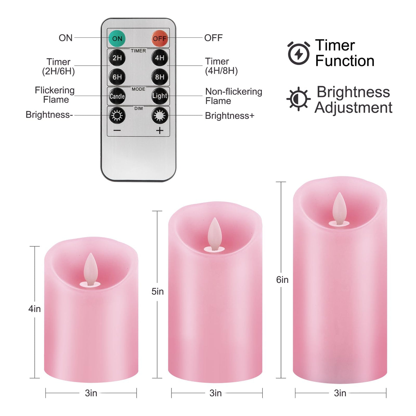 Q: How do I operate the remote control for the candles?A: The included remote control allows you to easily adjust the brightness of the Windshell Pink Flame Candles and set timers for 2, 4, 6, or 8 hours. Simply point the remote at the candles to make your adjustments.
