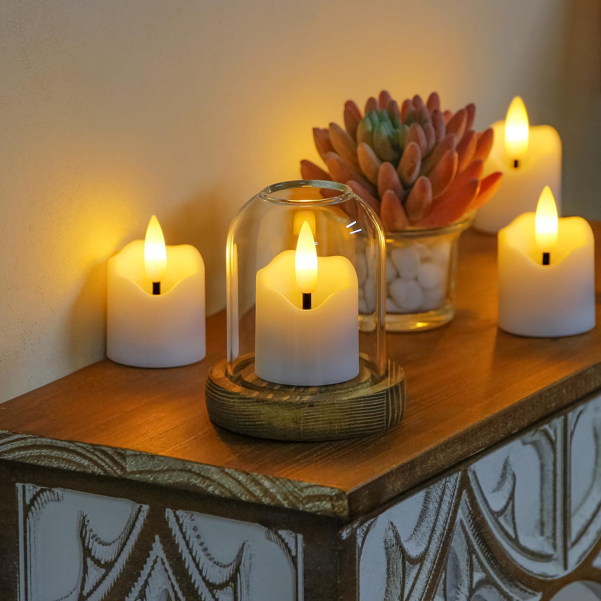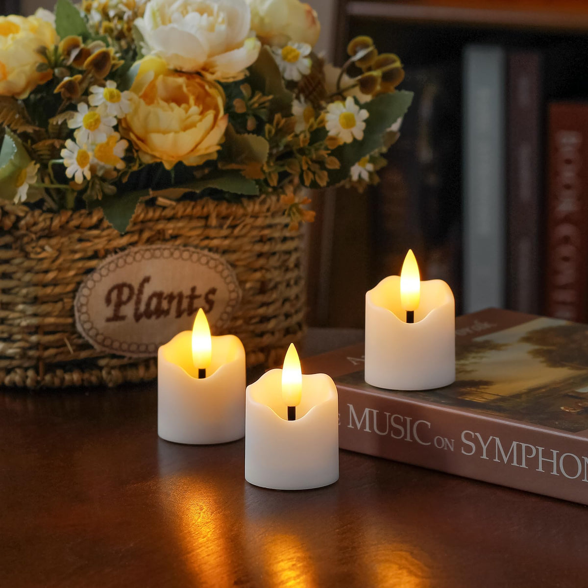 Q: What materials are the Wroxipel flameless candles made of?A: The Wroxipel flameless tealight candles are made of durable plastic, ensuring a realistic appearance and safe use without the risk of traditional open flames.