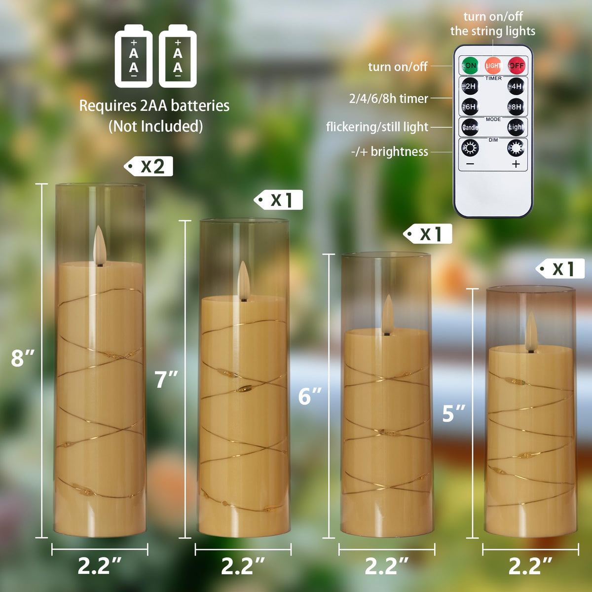 About Zevanor Flameless Candles Introduction: Special Design: Light Strings, Clear Plastic Package Included: 5X Led Candles, 1X 11-Key Remote Control, 1X Manual Color: Amber Diameter: 2.2 Inch Height: 5, 6, 7, 8, 8 Inch Material: Clear Plastic Battery Type: 2 Aa Long Lasting: 350 Hrs - 600 Hrs Function: Flameless, Flickering, Remote, Timer, Brightness, Light Strings