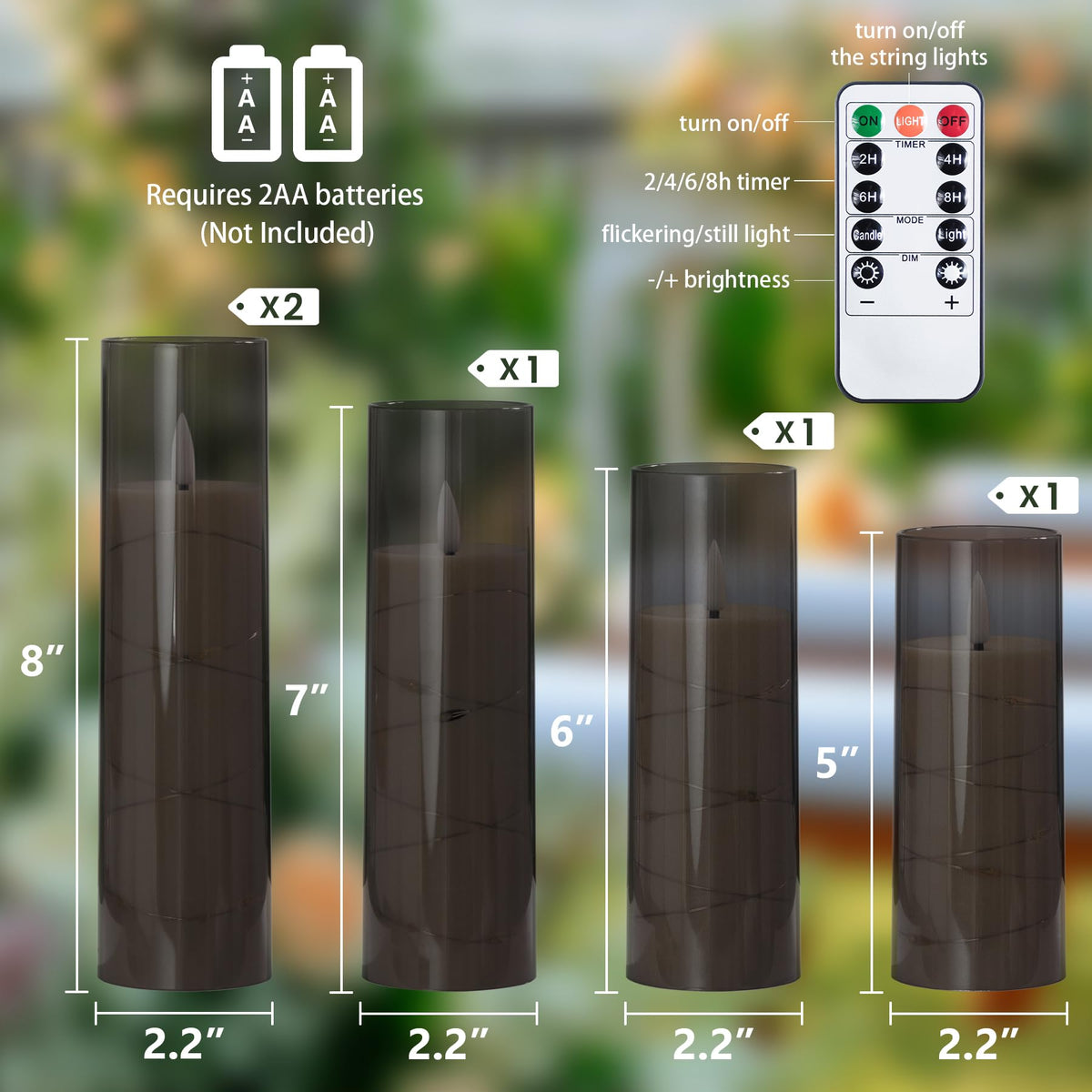 About Zevanor Flameless Candles Introduction: Special Design: Light Strings, Clear Plastic Package Included: 5X Led Candles, 1X 11-Key Remote Control, 1X Manual Color: Grey Diameter: 2.2 Inch Height: 5, 6, 7, 8, 8 Inch Material: Clear Plastic Battery Type: 2 Aa Long Lasting: 350 Hrs - 600 Hrs Function: Flameless, Flickering, Remote, Timer, Brightness, Light Strings