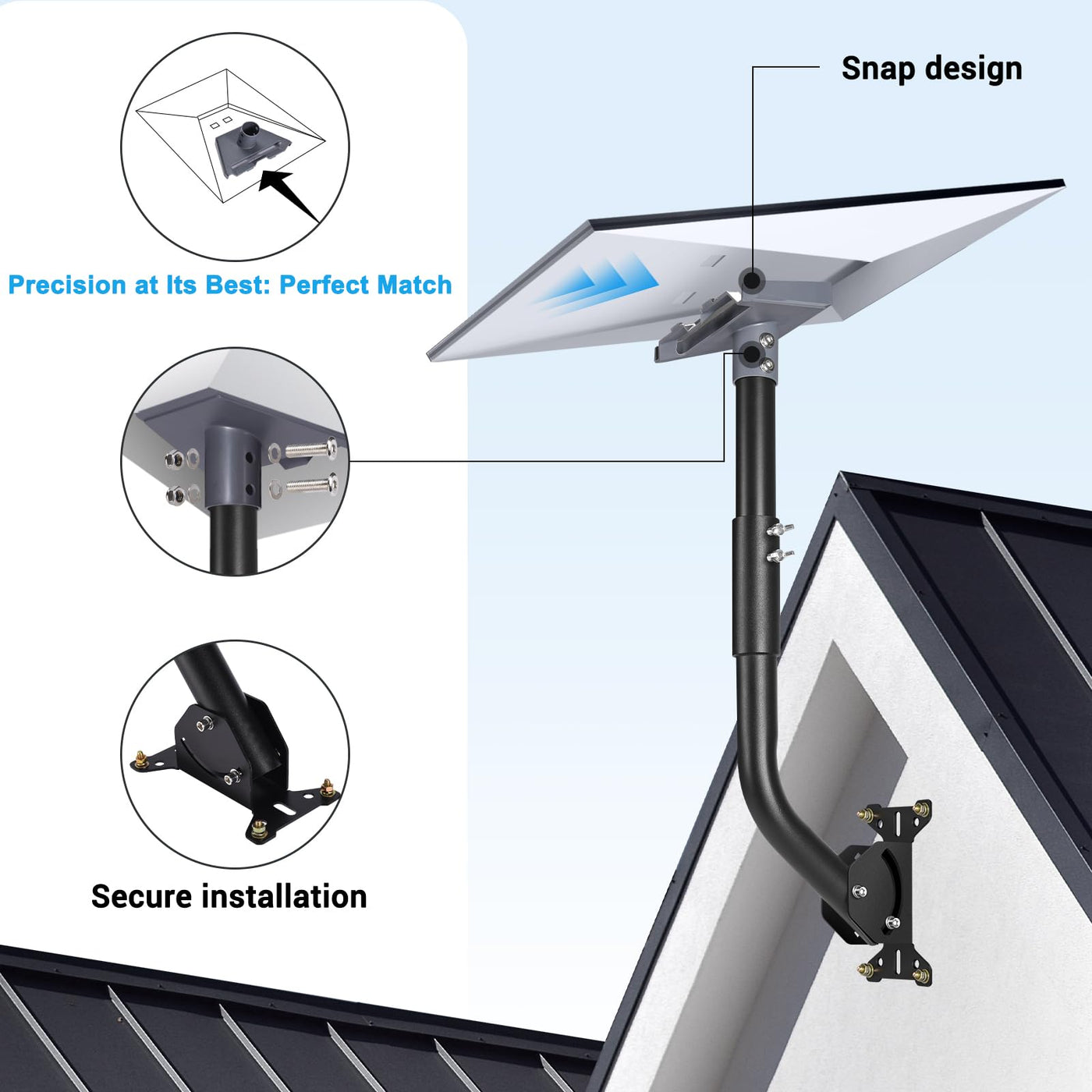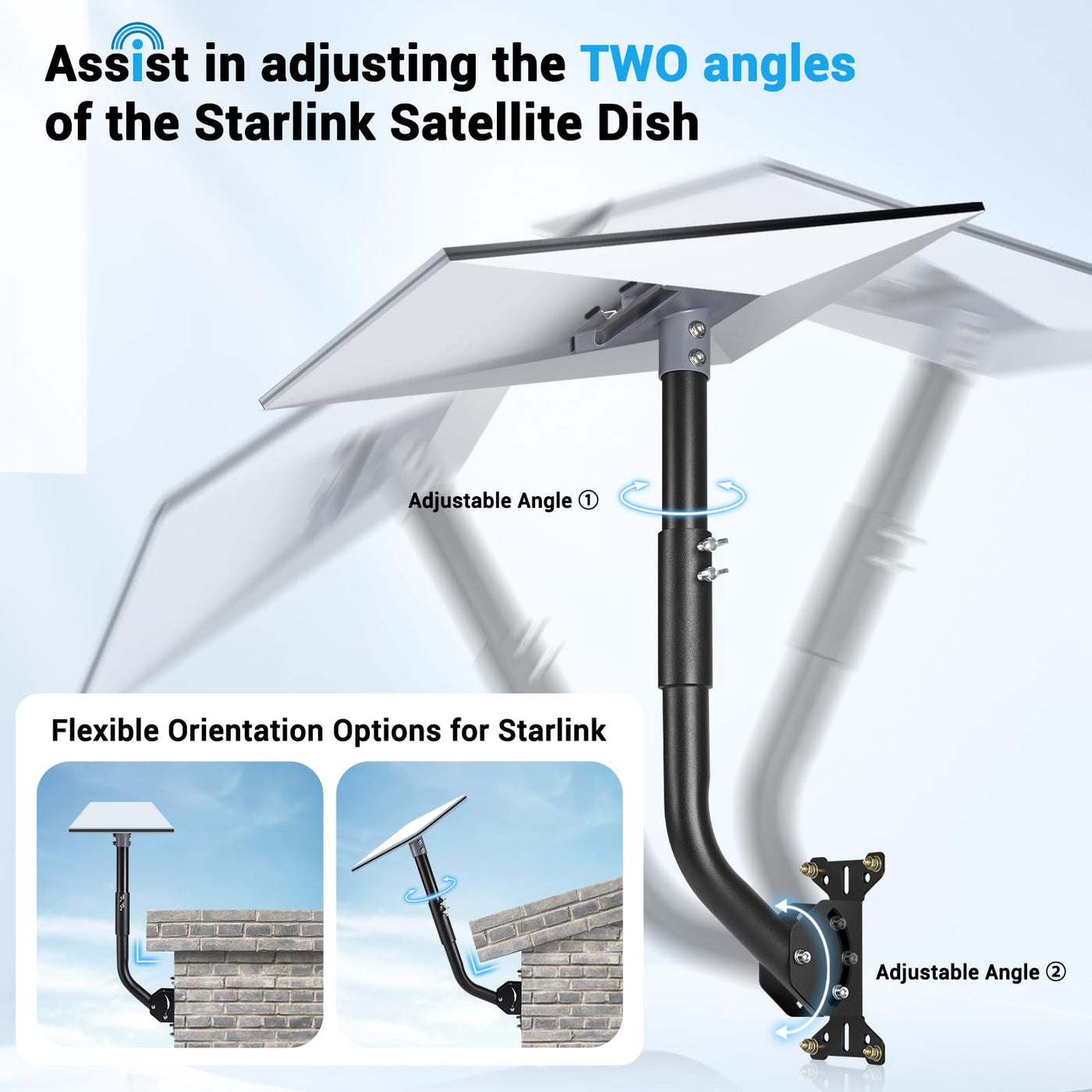 Q: Can the Starlink dish be adjusted after installation?A: Yes, the mount allows for adjustments in two angles: the pole connecting the pipe adapter can rotate for optimal dish orientation, and the base pole can adjust the overall angle to prevent any obstructions.