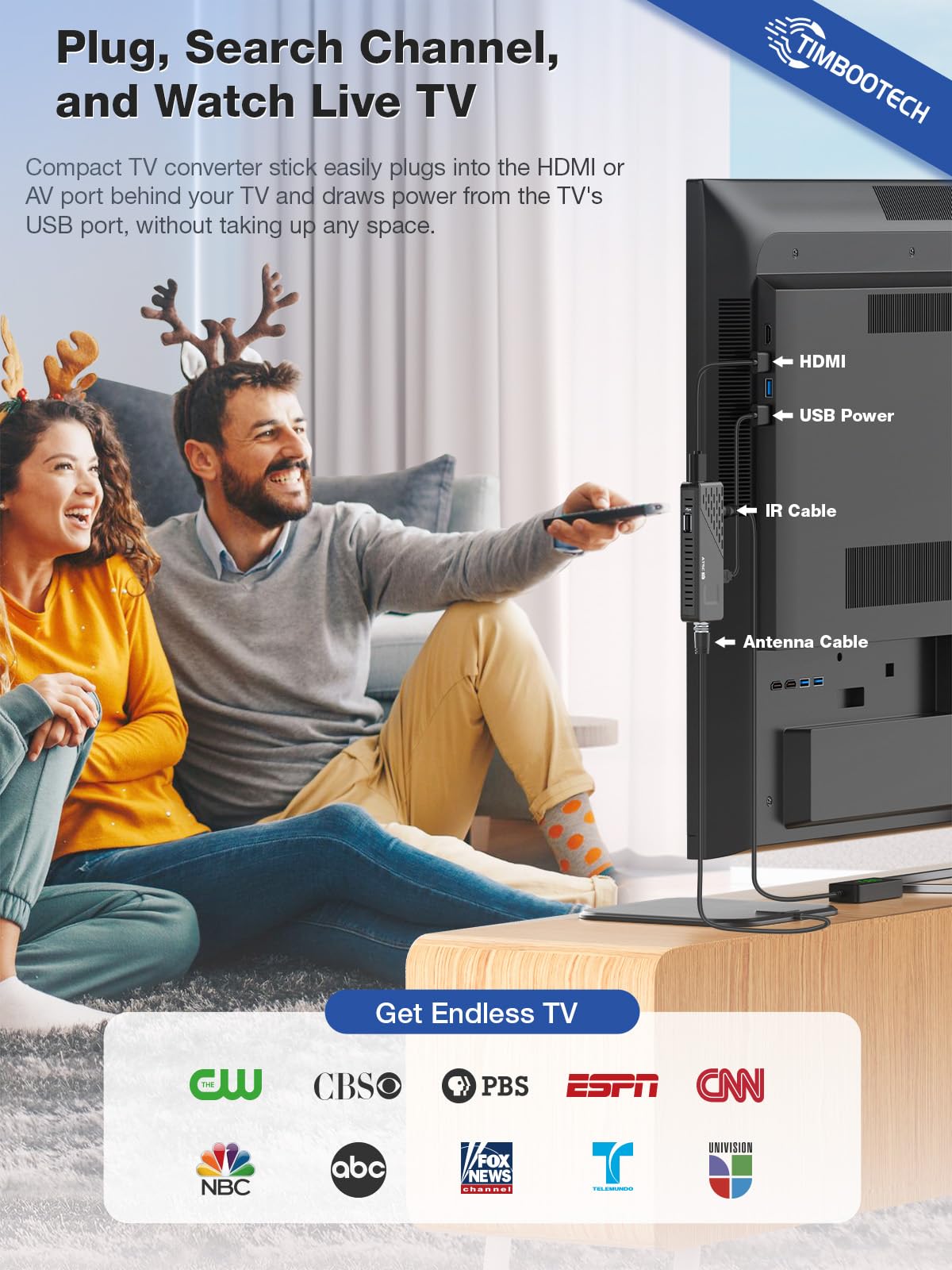 Q: What channels can I receive with the TIMBOOTECH Digital Converter Box?A: The TIMBOOTECH Digital Converter Box allows you to receive Over-The-Air ATSC digital broadcasts, enabling access to various free channels in 1080P HD resolution using your indoor or outdoor antenna.