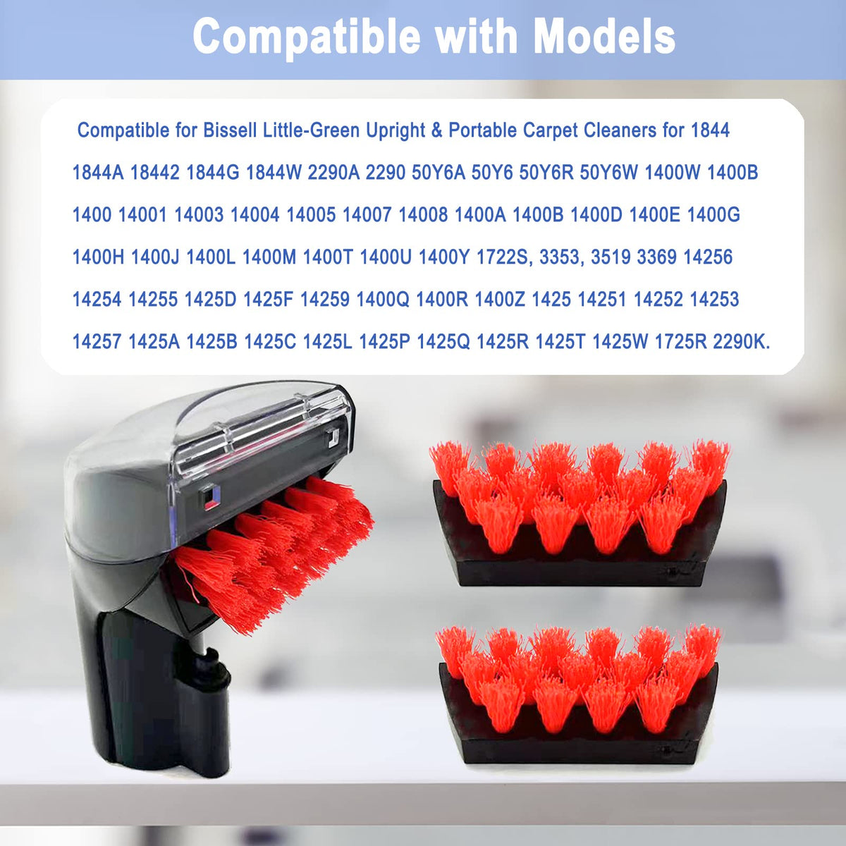 Compatible With Compatible For Bissell Little-Green Upright & Portable Carpet Cleaners For 1844 1844A 18442 1844G 1844W 3353 1986 2290A 2290 50Y6A 50Y6 50Y6R 50Y6W 1400W 1400B 1400 14001 14003 14004 14005 14007 14008 1400A 1400B 1400D 1400E 1400G 1400H 1400J 1400L 1400M 1400T, 1400U 1400Y 1722S, 3353, 3519 3369 14256 14254 14255 1425D 1425F 14259 1400Q 1400R 1400Z 1425 14251 14252 14253 14257 1425A 1425B 1425C 1425L 1425P 1425Q 1425R 1425T 1425W 1725R 2290K. Package Includes: 1 Pack Tough Stain Brush 2 Pack Replacement Brushes Note: Any Use Of The Bissell Brand Name Or Model Designation For This Product Is Made Solely For Purposes Of Demonstrating Compatibility.