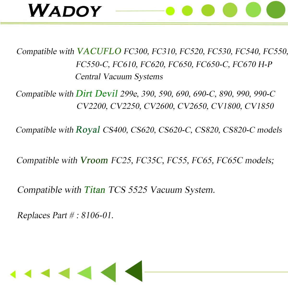 Replaces Part # : 8106-01. &Nbsp;- Compatible With Vacuflo Fc300, Fc310, Fc520, Fc530, Fc540, Fc550, Fc550-C, Fc610, Fc620, Fc650, Fc650-C, Fc670 H-P Central Vacuum Systems; - Compatible With Dirt Devil 299E, 390, 590, 690, 690-C, 890, 990, 990-C, Cv2200, Cv2250, Cv2600, Cv2650, Cv1800, Cv1850 Models; - Compatible With Royal Cs400, Cs620, Cs620-C, Cs820, Cs820-C Models; - Compatible With Vroom Fc25, Fc35C, Fc55, Fc65, Fc65C Models; - Compatible With Titan Tcs 5525 Vacuum System. How Long To Change Your Filter? - With Use, Your Filter May Become Clogged With Dirt And Debris, And Your Vacuum Performance And Airflow May Suffer. To Get Optimal Performance Out Of Your Vac, Its Better To Replace The Filter At Least Twice A Year With Average Use. Note: This Is An Aftermarket Replacement Vacuum Cleaner Filter Manufactured By Wadoy. Any Vacuum Cleaner Manufacturer Brand Name Is Used Solely For The Purpose Of Demonstrating Compatibility The Product Is Not Sponsored Or Endorsed By ,Or Affiliated With The Brands It Fit ,Including Dirt Devil, Vacuflo, Vroom,Titan, Royal.