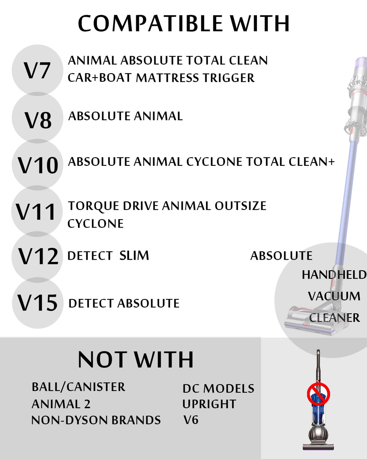 Compatibility: The HUACITY Attachments Holder is compatible with a wide range of Dyson vacuum models, including V15, V12, V11, V10, V8, and V7. It accommodates various accessories such as extension hoses, wands, crevice tools, soft dusting brushes, motorized mattress brushes, and more. Please note that this holder is not suitable for canister, ball, DC, or V6 models.