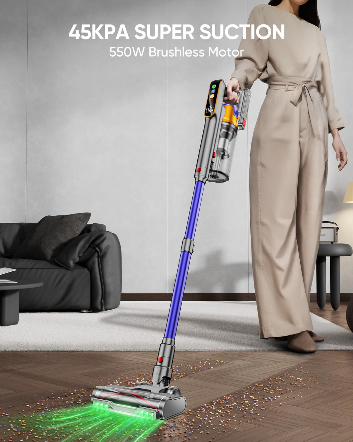 Q: What is the suction power of the DIFFULL Cordless Vacuum Cleaner?A: The DIFFULL Cordless Vacuum Cleaner features a powerful suction power of 45KPA, thanks to its upgraded 550W brushless motor, making it highly effective for picking up dust, dirt, and pet hair from various surfaces.
