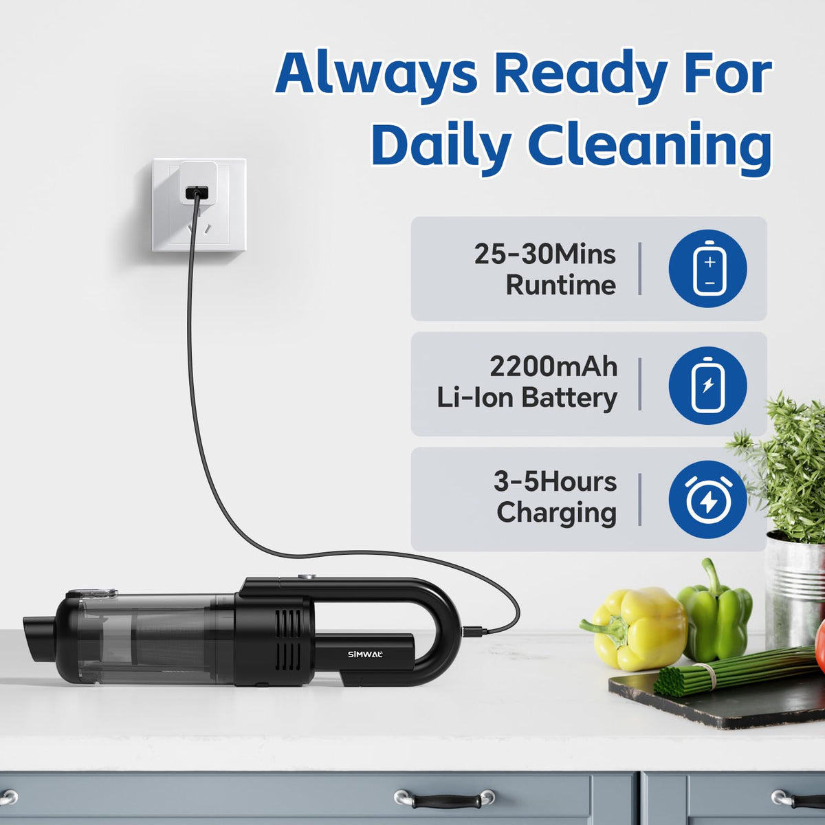 Q: How long does the battery last on this cordless vacuum?A: This cordless vacuum is equipped with a rechargeable lithium-ion battery of 2200mAh capacity, allowing it to operate for up to 30 minutes on a single charge, which is significantly longer than many other models.