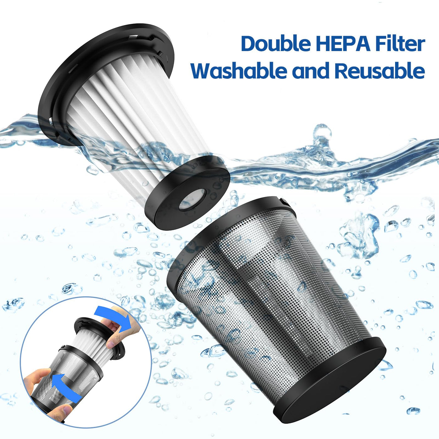 Q: How does the double filter technology work in this vacuum?A: The vacuum utilizes advanced double filter technology, combining HEPA filters with a precision steel filter element. This setup enhances filtration efficiency, reduces dust overflow, and minimizes secondary pollution, ensuring a cleaner environment during use.