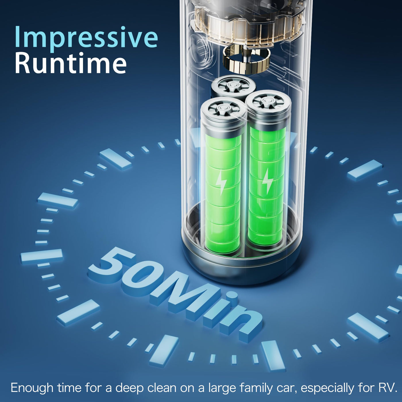 Q: How long does the battery last on a full charge?A: The built-in rechargeable battery provides an approximate runtime of 12 to 50 minutes, depending on the suction mode you select, allowing ample time for thorough cleaning.