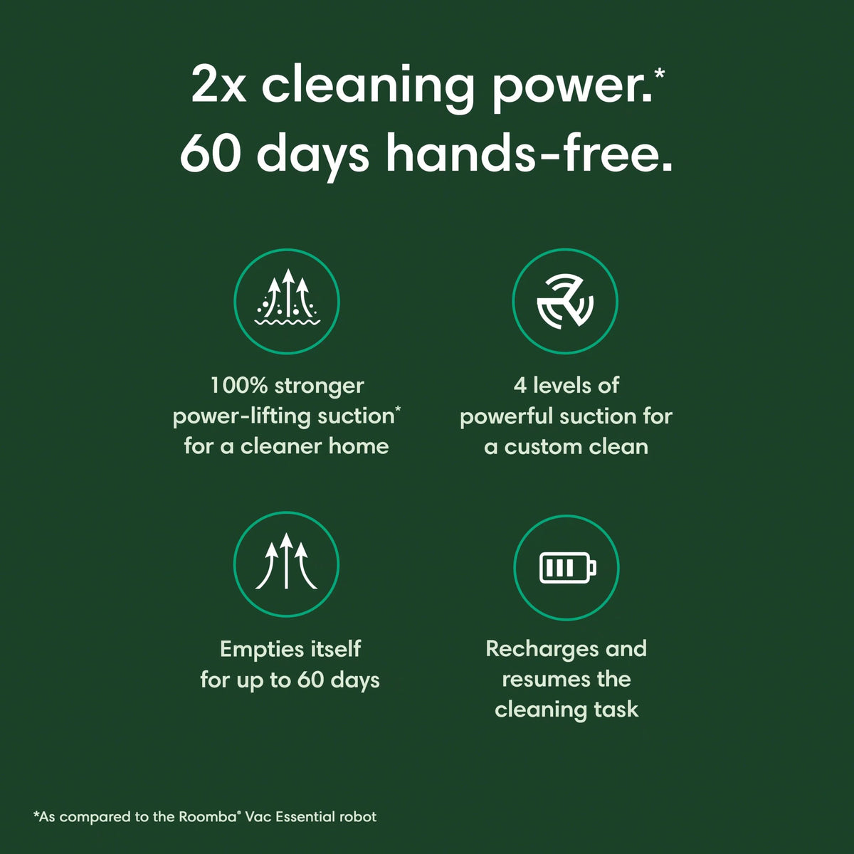The Roomba Vac 2 Robot + Autoempty Dock Makes Cleaning Effortless, With 2X Cleaning Power* And Navigation Technology That Guides It To Vacuum Your Floors In Neat Rows. Best Of All, It Empties All On Its Own Into A Bag That Holds Up To 60 Days Of Dirt And Debris-Giving You More Time To Do The Things You Love. *As Compared To The Roomba Essential Robot