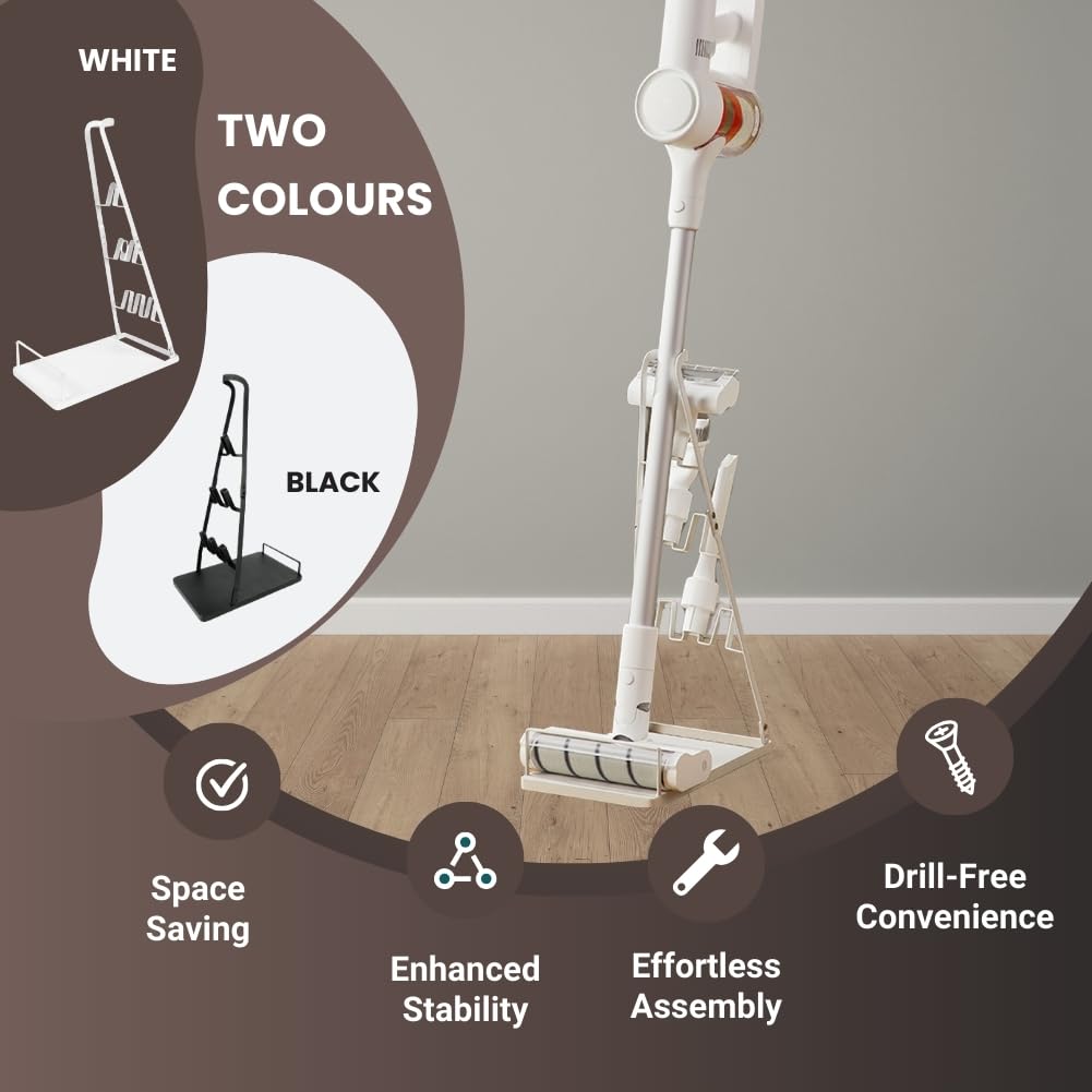Q: How does the IZSOHHOME Vacuum Stand help save space in my home?A: This vacuum stand provides a stable storage solution for your vacuum cleaner and its accessories without the need for wall drilling. It keeps everything organized in one place, allowing for easier access and helping you save valuable floor space.