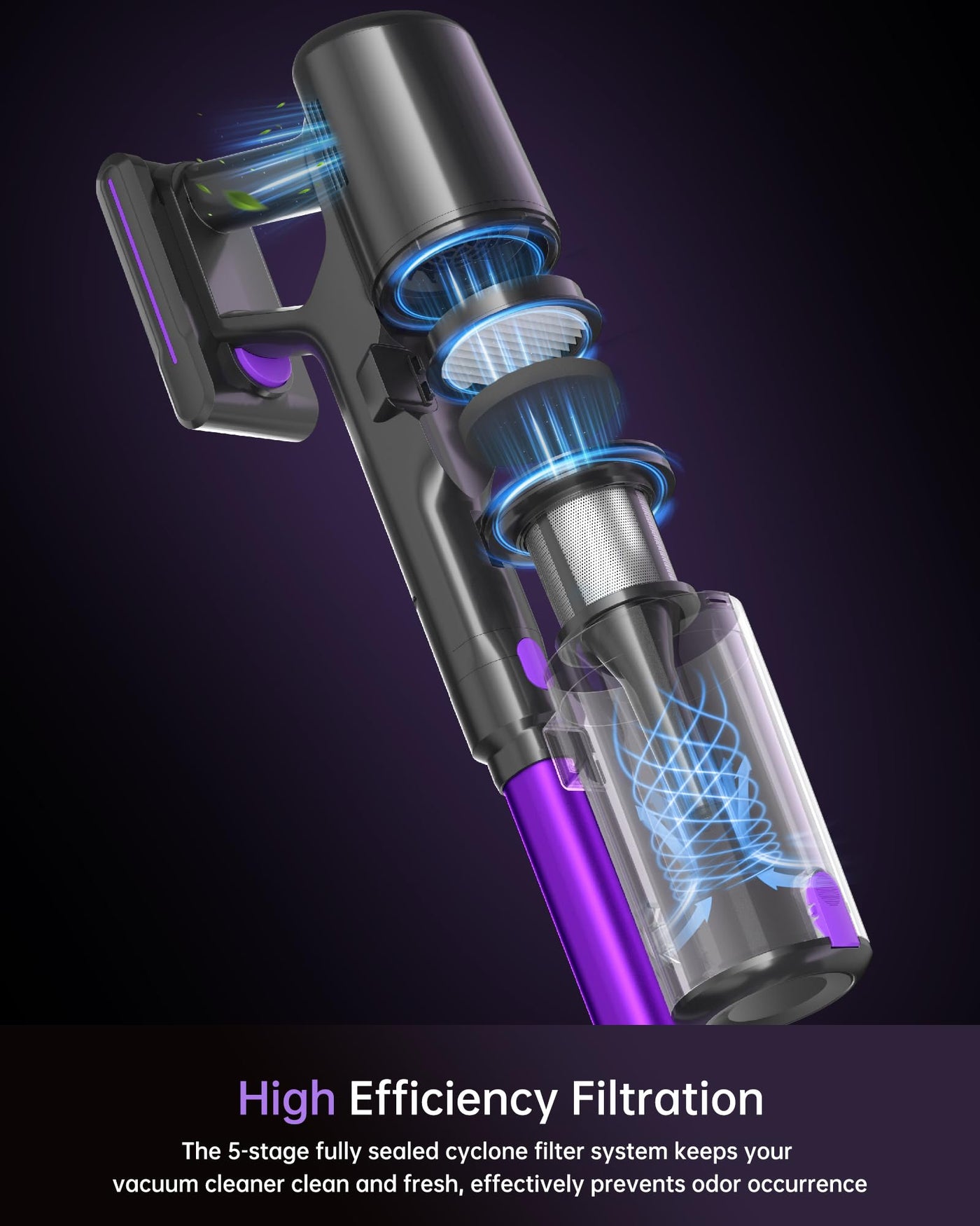 Q: How do I maintain the OXVAC vacuum's filtration system?A: The OXVAC vacuum features a high-efficiency 5-stage filtration system that captures 99.99% of dust particles. You do not need to clean the HEPA and metal filter for up to 100 uses, thanks to its long tube type dust cup design that facilitates easy garbage separation.