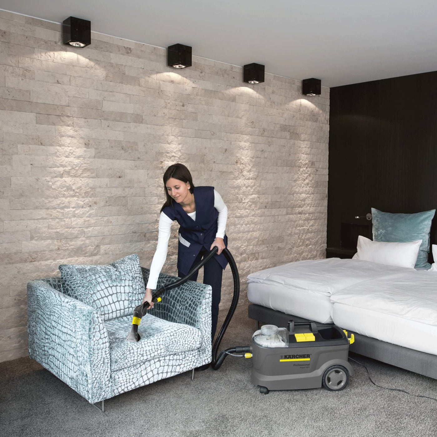 The Puzzi 10/1 Is Ideal For Cleaning Smaller To Medium-Sized Carpets, Upholstery And Textile Flooring. The Modular Accessories Are Kept Directly On The Machine. The Carrying Handle Offers A Clip For The Wand And Makes Transportation Easy. Perfectly Suitable For Everyday Use. With A Powerful 12.5 Psi Spray Rate, The Water And Detergent Solution Is Applied To The Area Being Cleaned And Picked Up Immediately By The Vacuum Nozzle. Cleaned Surfaces Can Be Walked On Almost Right Away As Very Little Residual Moisture Remains. Carpets Dry Up To 63% Faster Than Those Cleaned With Other Comparable Products.