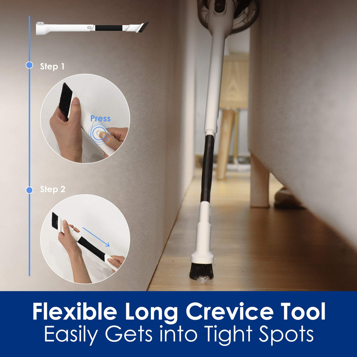 - Flexible Long Crevice Tool: Designed to easily bend, this tool effortlessly reaches into tight spots, making it suitable for cleaning dust beneath furniture, alongside refrigerators, and in the narrow space behind sofas.