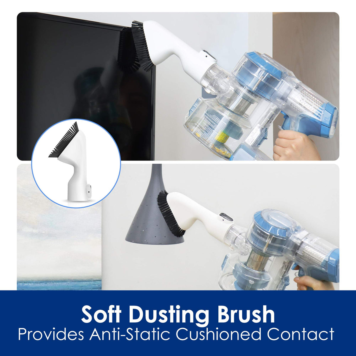 - Soft Dusting Brush: The angled bristles on this slender, oval-shaped brush ensure anti-static cushioned contact. It is ideal for dusting shelves, lighting fixtures, delicate surfaces, electronics, and more.
