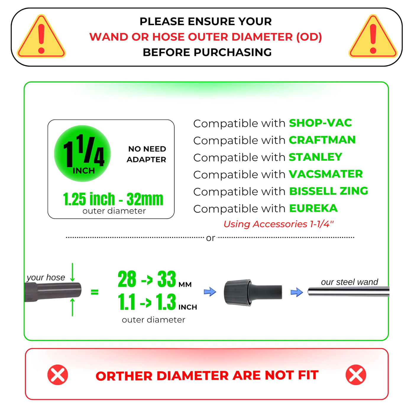 -[Important] Suitable For Smooth Floors &Amp; Low-Pile Carpets. Not High Pile. Compatible With Circular Shape Vacuum Hoses Only. -1.25'' Standart Vacuum Attachments: Fits Vacuum Cleaners With 1-1/4-Inch Outer Diameter Vacuum Tube / Wand. Compatible With 2 & 2.5 Gallons Craftsman Shop Vac, Small Hand-Held Shop Vac; 4, 5 & 6 Gallons Stanley Shop Vac, 2, 5, 6 & 8 Gallons Shop-Vac Wet/Dry Vacuum. -For Vacuum Cleaners With 35Mm Outer Diameter Vacuum Hose: Use The Vacuum Hose Adapter Kit Included. -Horse Hair Floor Brush: The Bristles Are Soft And Gentle, It'S Safe To Use On Any Surface Without Scratches. Suitable For Hardwood Floor, Bare Floor And Tile Floor. -1.25 Inch (1 1/4 Inh Or 32Mm) Extension Wand Replacement: Durable Stainless Steel Wand Extends Up To 39 Inches