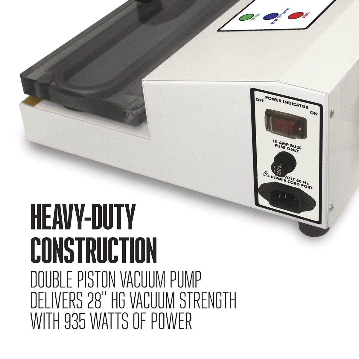Q: How powerful is the Weston Vacuum Sealer?A: This vacuum sealer operates at 935 watts, providing strong suction power with a double piston pump that draws up to 28 inches of mercury vacuum strength.