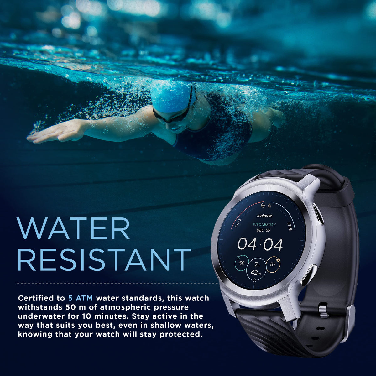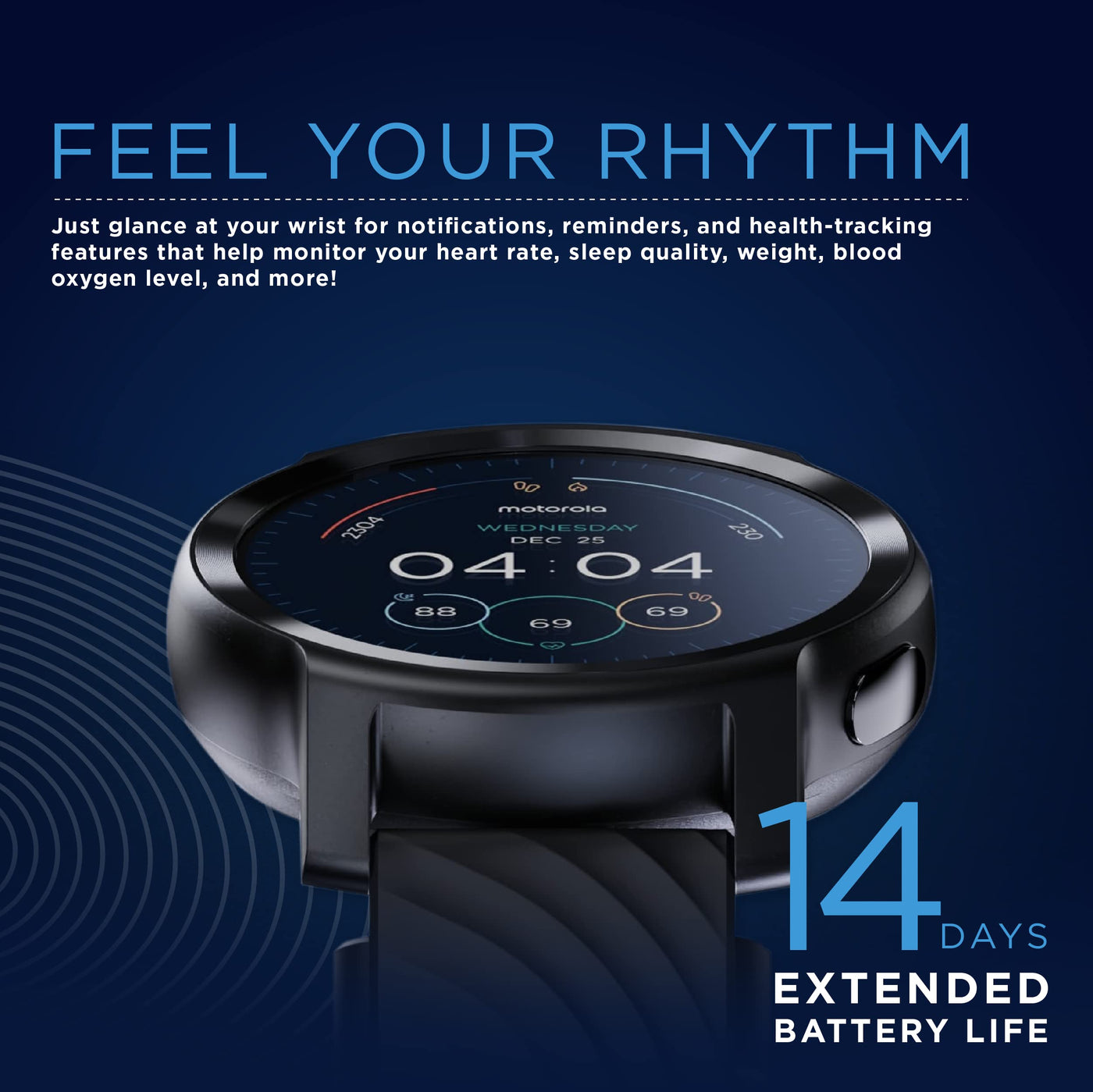 Feel Your Rhythm! The Beautifully Designed Airplane-Grade Aluminum Moto Watch 100 Is Ready To Help You Meet Your Goals With Dynamic Health Tracking, Including More Than 26 Sport Modes, A Heart-Rate Monitor, Sleep Tracking, And Step Counting. Track Your Progress Through An Accelerometer, A Gyroscope, A Heart-Rate Monitor, And An Sp02 Sensor. Multiple Lifestyle Features, Goal Settings, And Smart Notifications Put Your Finger On The Pulse Of Self-Improvement.Get More From Your Grind With A Battery Boasting Up To Two Weeks Of Full-Time Use And A 30-Day Stand-By. One 60-Minute Charge Lets The Watch Last Longer Than The Fresh Produce In Your Fridge, And The 5 Atm Water Resistance Empowers You To Stay Active In Any Circumstances. This Women'S And Men'S Smart Watch Is An Accountability Buddy That Won'T Let You Down. Even Better, This Smart Watch For Android Or Iphone Offers An Intuitive Motowatch Os That'S Fully Compatible With The Devices You Already Have. Choose Between Phantom Black Or Glacier-Silver Colors For A Fashionable Addition To Your Wrist That Weighs Only 29 G.Ebuynow Is An Official Brand Licensee Of Motorola And Ensures Global Sales And Support For The Products It Sells.