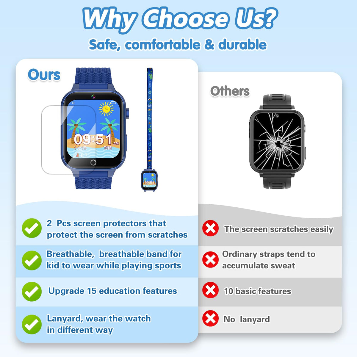 Smart Watch For Kids Boy Gift Ages 3-12, 2 Screen Protector, 26 Puzzle Games, Hd Camera Video Music Player Touchscreen Pedometer