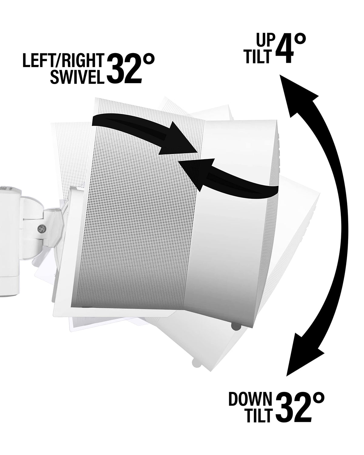Q: Does the mount allow for tilting and swiveling of the speaker?A: Absolutely! The mount features tool-free tilt and swivel adjustments, allowing you to tilt the speaker 32° left and right, and 4° up and 32° down, ensuring you achieve the perfect listening angle from anywhere in the room.