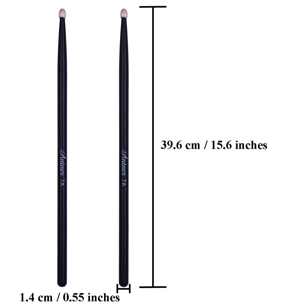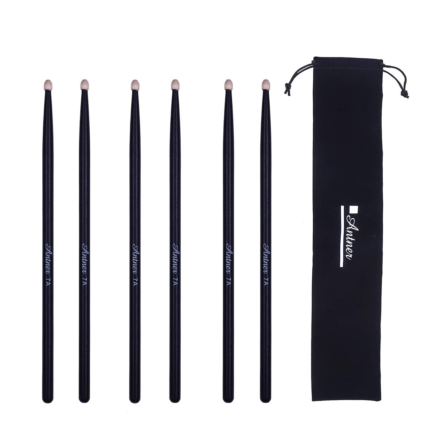 Antner Black 7A Drum Sticks, 3 Pairs Drumstick Material: Maple Wood Package Included: 3 Pairs Black 7A Drumsticks 1 Piece Black Velvet Storage Bag Drumsticks Size: 39.6Cm / 15.6 Inches Storage Bag Size: 8 45Cm / 3.2 17.7Inches Application: Suitable For Any Crowd, You Can Beat A Very Clear Grainy, Whether Jazz, Pop, Light Rock, Fusion Music And So On Are Still Appropriate